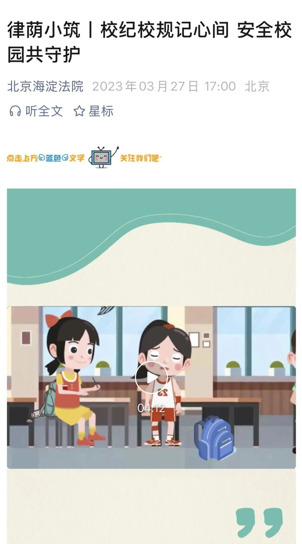 海淀法院少年法庭于2019年创建“律荫小筑”品牌,旨在以司法保护促推学校保护、家庭保护协同发力,提升辖区内中小学校依法治校能力及法治教育水平,赋能基层法治建设。该品牌以院校联动为建设平台,打通基层法院与辖区内学校和家庭间的连接,以学生、家长和教师为主要受众对象,坚持“抓前端、治未病”,以主题开放日、法治微课堂、普法手册、新闻发布会等特色活动为抓手,建立未成年人司法特色工作机制,提升未成年人权益保水平。