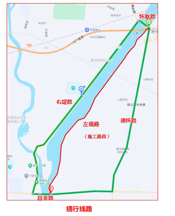 工程计划于2025年9月5日开工,预计2025年10月底完工。施工期间,工程采取双向占路方式进行,市民可绕行右堤路、通怀路等周边道路(请参照交通导行示意图)。
