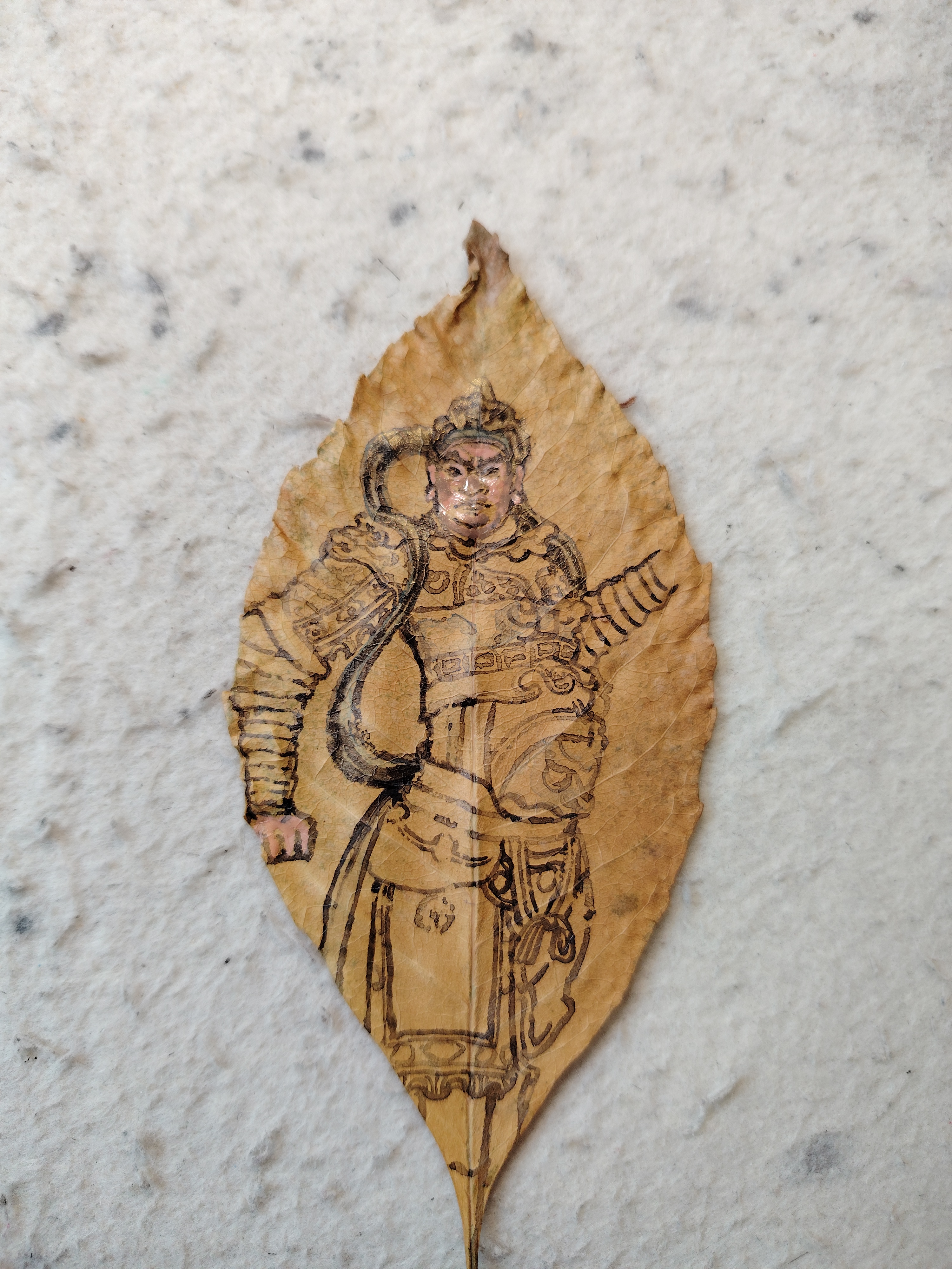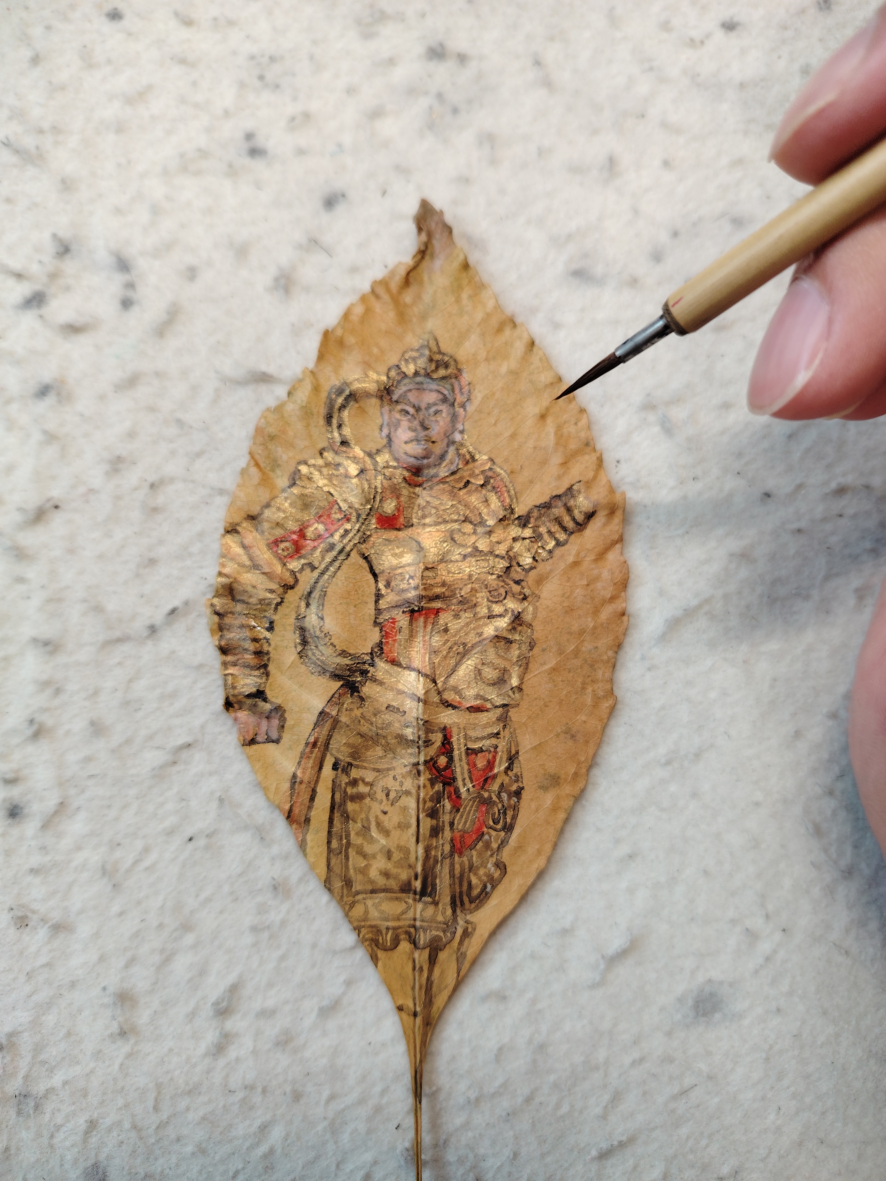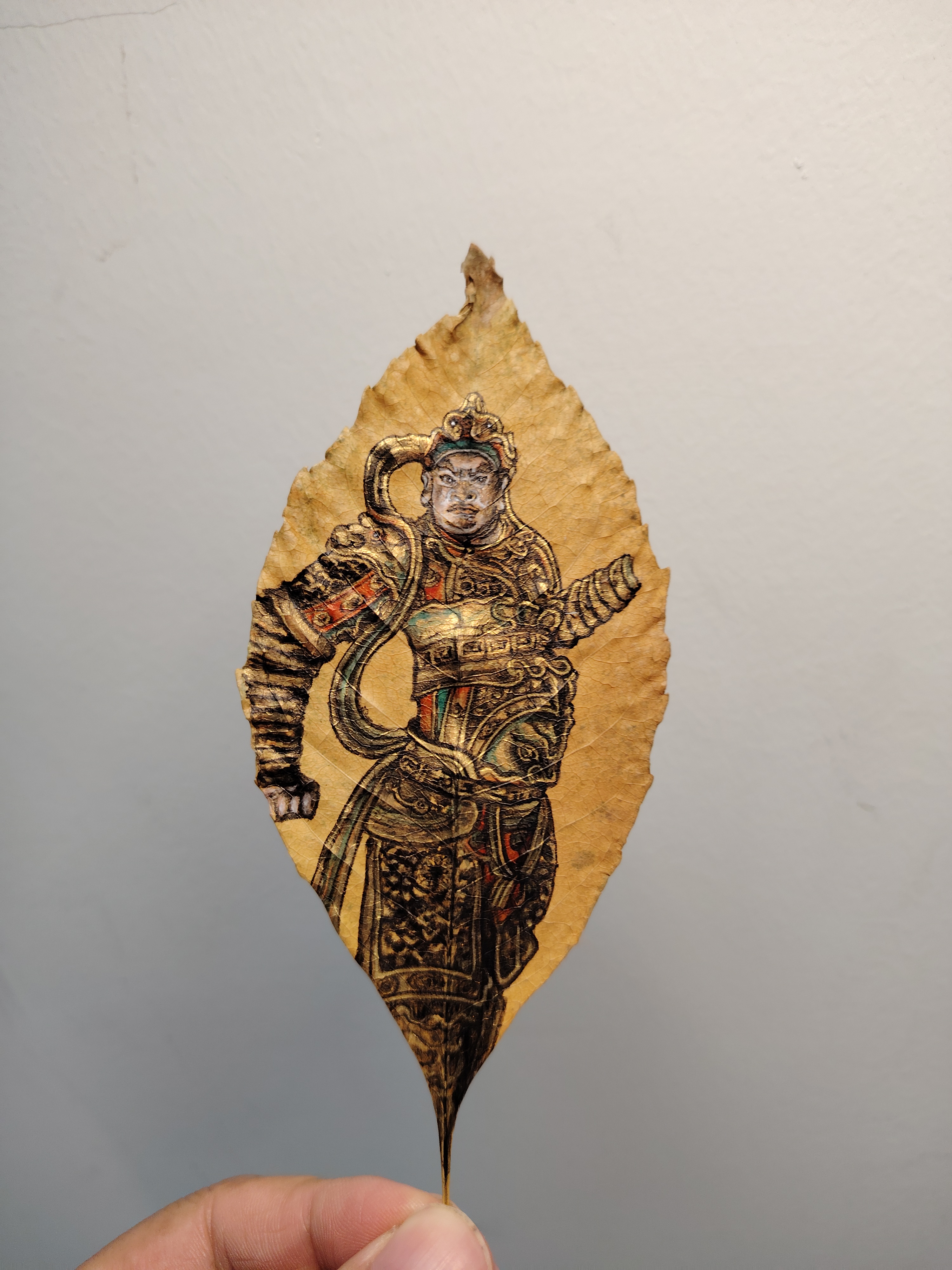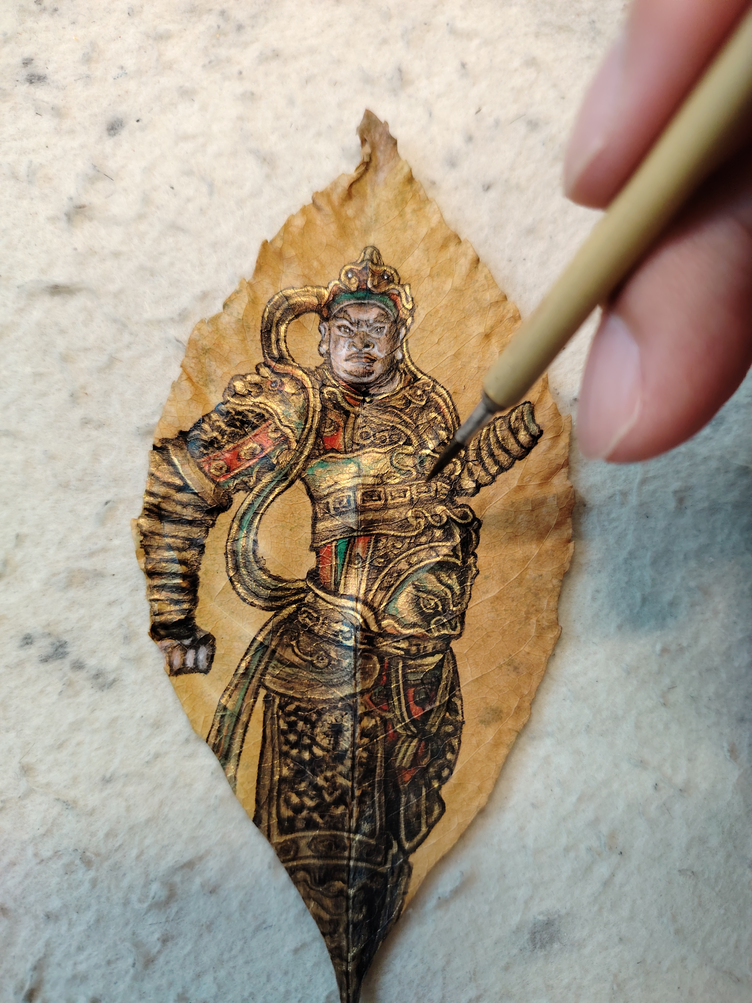 回京后开始创作,以双林寺有着“天下第一韦陀”美誉的雕塑为灵感,在叶上创作,呈现当代审美与传统雅致相融合的新风貌!