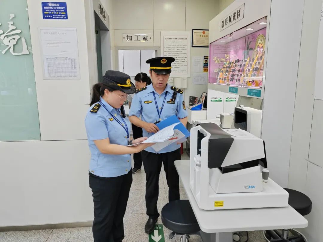 隐形眼镜、角膜塑形镜作为第三类医疗器械,直接关乎眼部健康。区市场监管局瞄准经营企业、使用单位,通过线上线下筛查,精准摸排企业经营使用情况,日常检查与飞行检查双管齐下。同时,执法人员深入辖区眼镜店,聚焦眼镜验光、配镜环节,重点针对验光仪、焦度计、验光镜片箱等计量器具进行全面“体检”,确保所有设备均在检定有效期内、证书齐全有效、使用及维护合规。