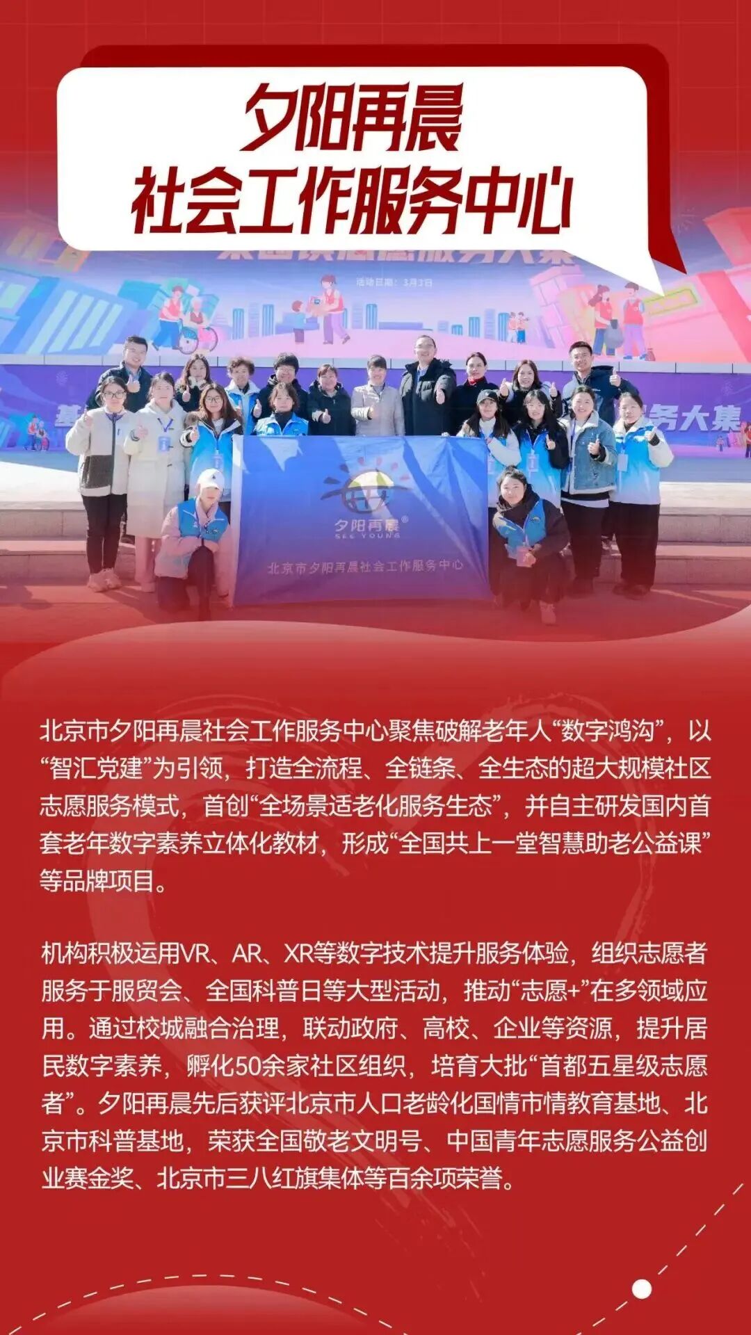 在服务过程中,夕阳再晨积极运用VR、AR、XR等前沿数字技术,不断提升服务体验。不仅如此,还组织志愿者活跃于服贸会、全国科普日等大型活动现场,推动“志愿+”模式在多领域广泛应用。通过校城融合治理的创新方式,联动政府、高校、企业等多方资源,有效提升了居民的数字素养。在这个过程中,成功孵化出50余家社区组织,培育出大批“首都五星级志愿者”,为志愿服务事业注入源源不断的新生力量。