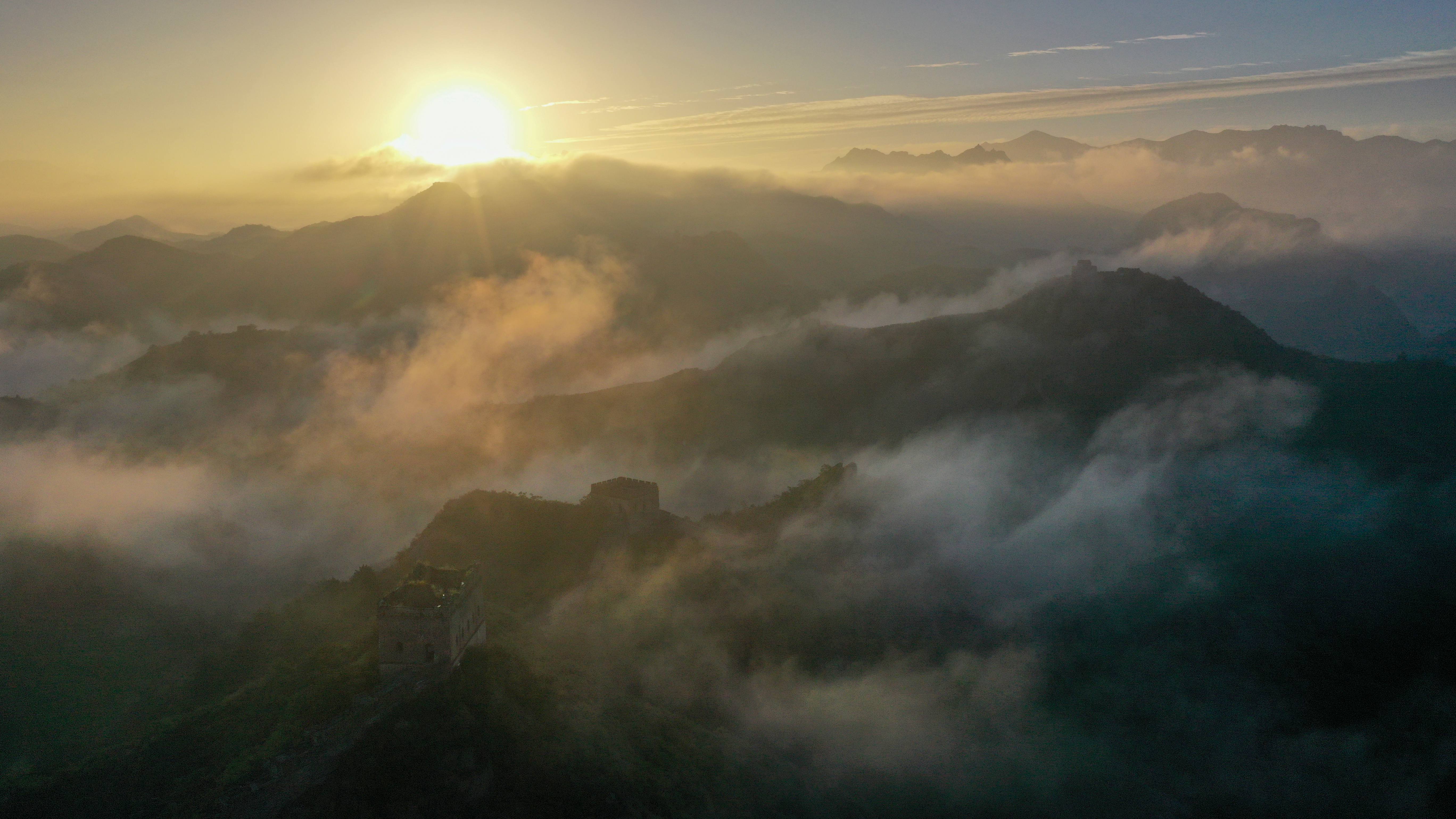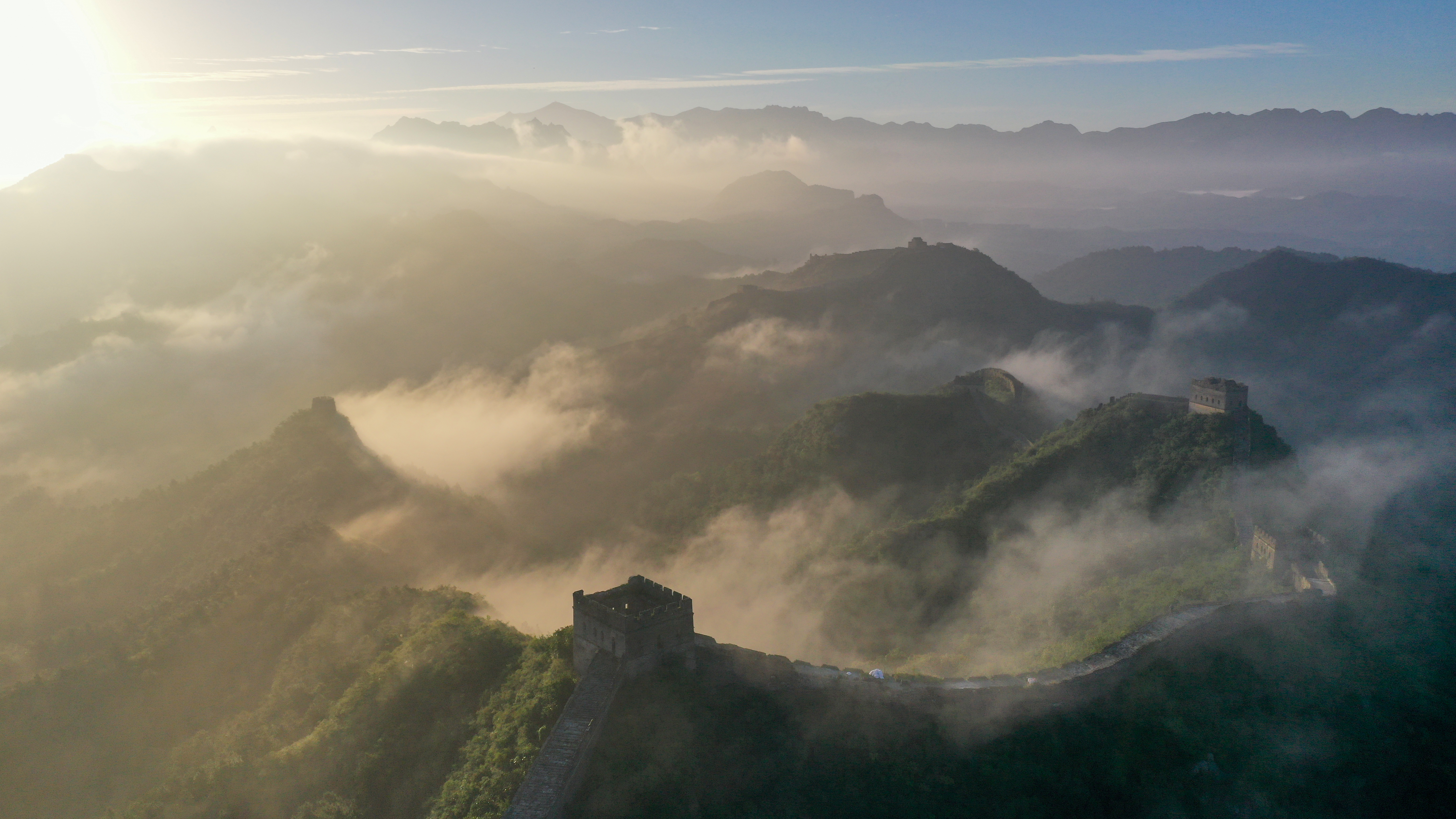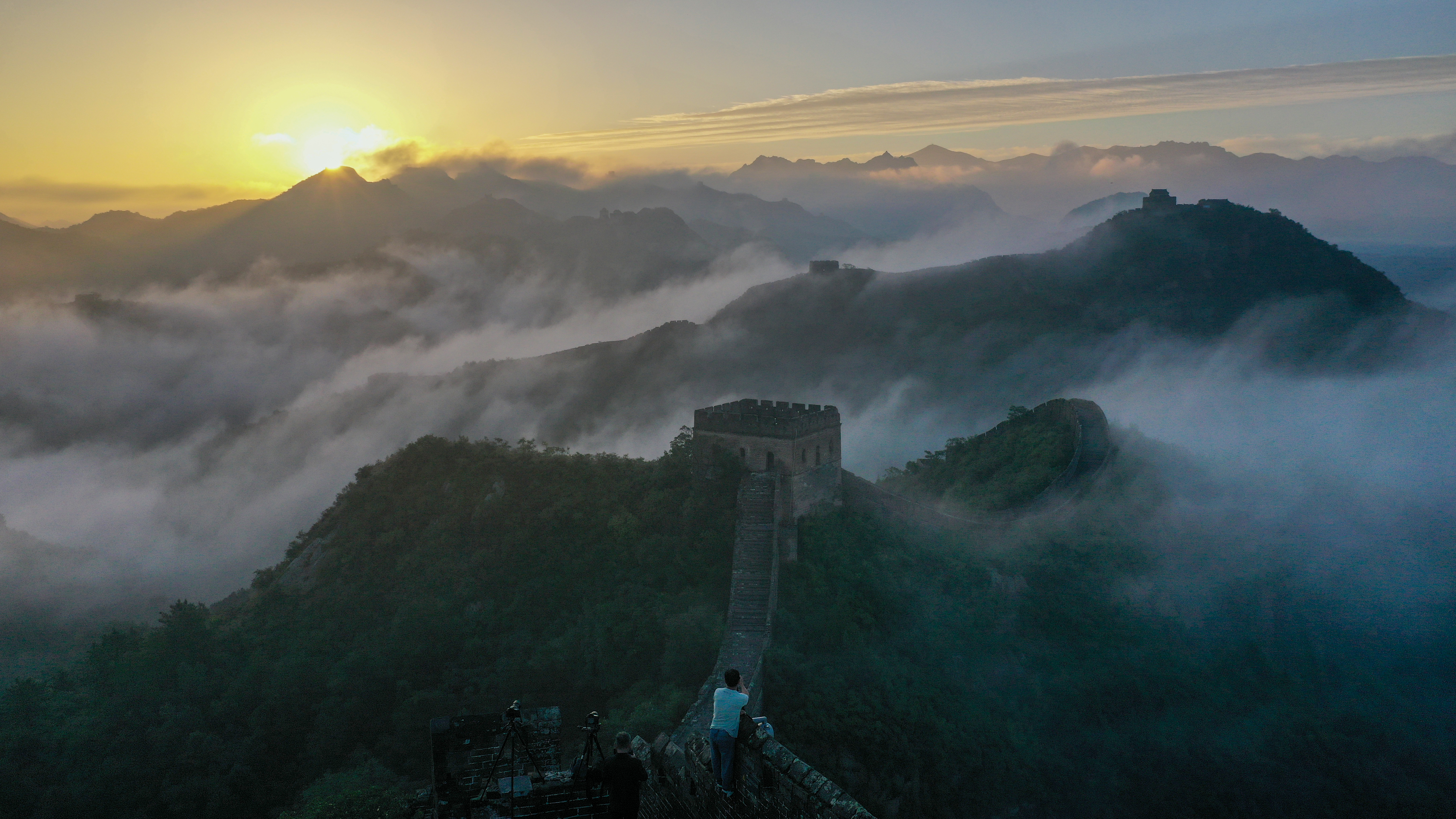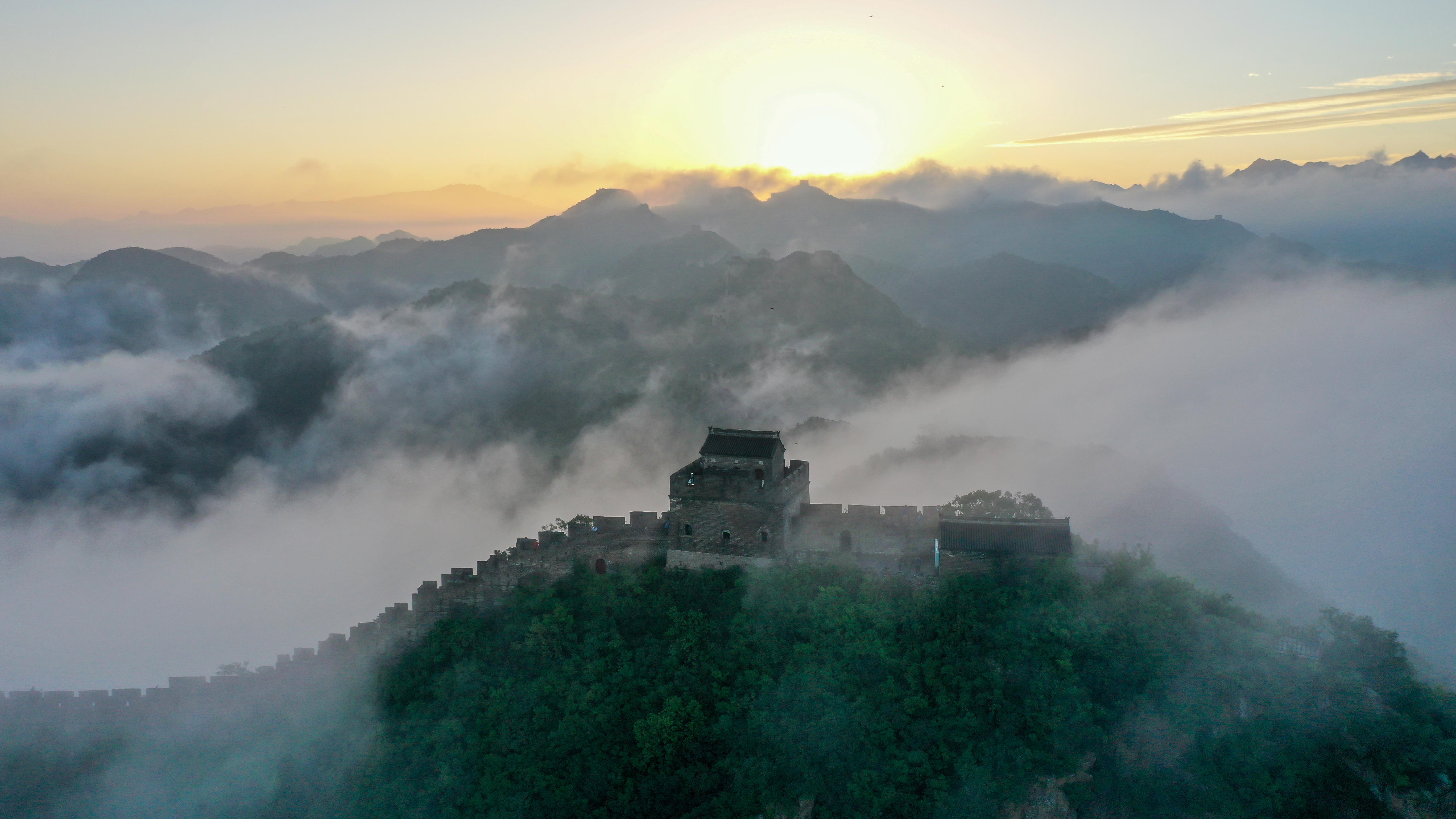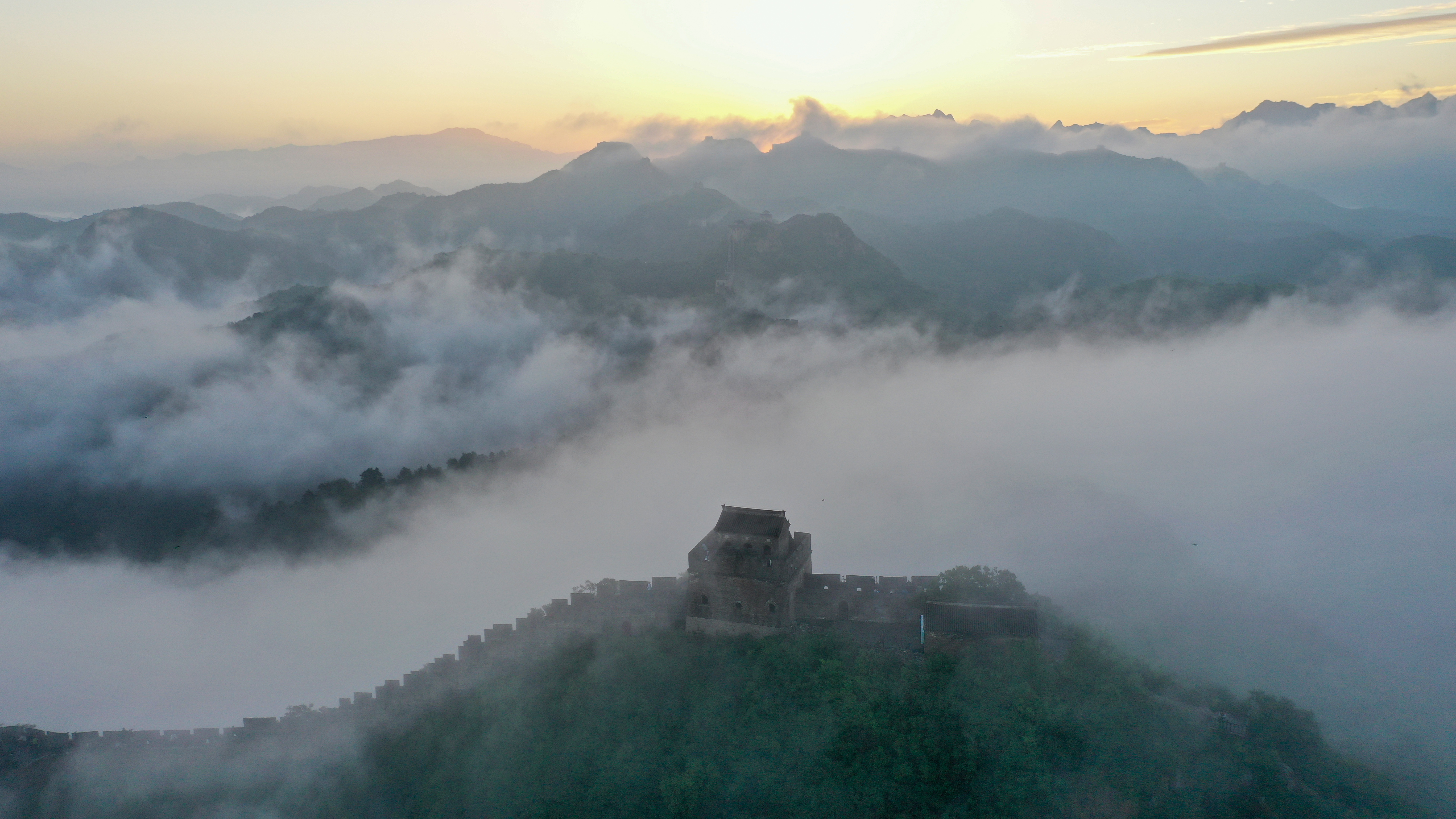 一场秋雨过后,清晨时分的河北省承德市滦平县金山岭长城云海涌动,烟波浩渺,云海中的古长城、山峦,若隐若现,宛若仙境,壮美若画(图片摄于2025年9月6日无人机照片)。