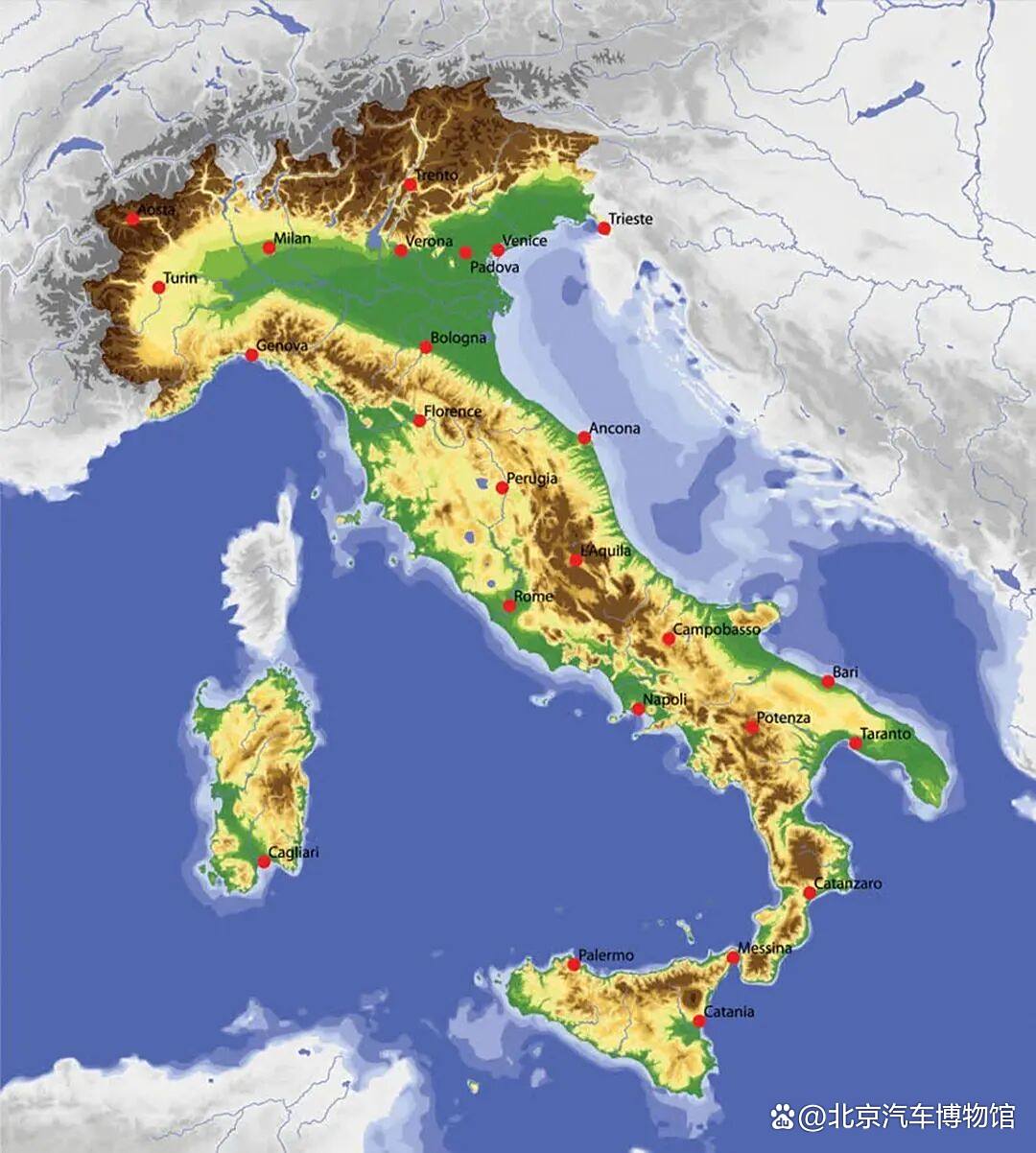意大利共和国(Repubblica Italiana),简称意大利,首都罗马,位于欧洲南部,包括亚平宁半岛及西西里、撒丁等岛屿。北与法国、瑞士、奥地利、斯洛文尼亚接壤,东、南、西三面分别临地中海的属海亚得里亚海、爱奥尼亚海和第勒尼安海。总面积301333平方千米,海岸线长7200多千米。大部分地区属亚热带地中海气候。全国划分为20个行政区,101个省,以及5个特别自治行政区。人口约5900万。 意大利人口主要是意大利人,讲意大利语。