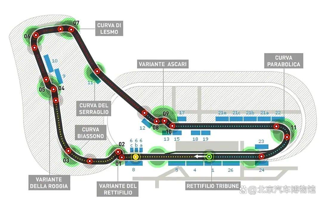 举办意大利大奖赛的蒙扎赛道位于意大利米兰东北部皇家公园内,启用于1922年,是世界上仅次于英国的布鲁克兰兹赛道和美国的印第安纳波利斯赛道的第三座专用制式赛车场及第三古老的永久性赛道,大倾角的弯道是本赛道的重要特征,被誉为“速度的圣殿”,时至今日仍有一部分赛道在使用。赛道全长5.793公里,全油门路段占比75%,赛车极速可达360km/h。自1950年开始承办F1意大利站的比赛至今,仅在1980年因改建解决噪音问题暂停。