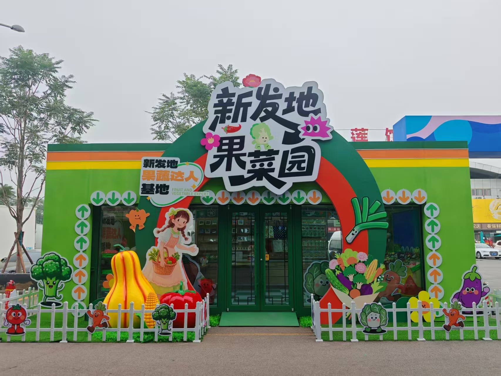 走进新发地果菜园文创商店,整体以象征生态活力的绿色为主调,搭配红、橙、黄、蓝等丰收色彩,在空间设计中融入蔬果造型、地标场景等元素,将传统农产品批发市场的烟火气息与现代创意美学巧妙融合。店内设有文创展销区与互动体验区,通过艺术化陈列与沉浸式互动,让游客在逛市场的同时也能感受文化魅力。
