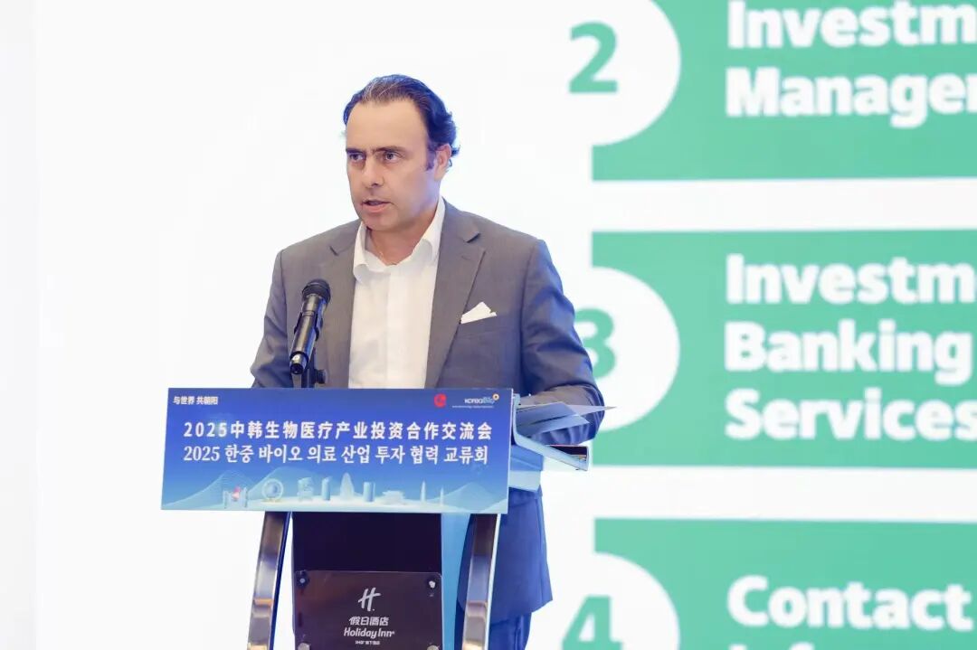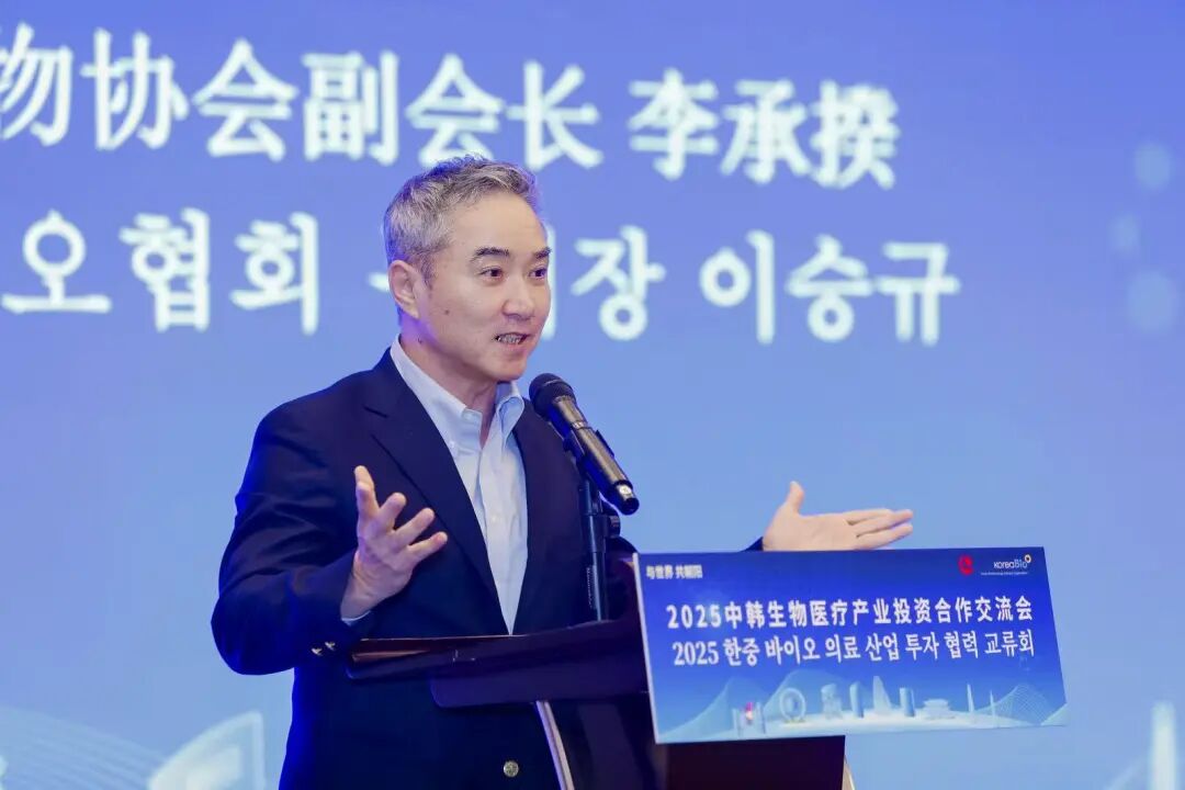 韩国生物协会副会长李承揆致辞。他表示,非常荣幸能率韩国代表团再次参与中韩生物医疗产业投资合作交流会。韩国在生物医疗技术研发、高端医疗器械生产等领域积累了丰富经验,而北京朝阳区作为中国生物医疗产业的重要聚集地,拥有广阔的市场空间、完善的产业配套和高效的创新生态,双方合作潜力巨大。希望双方能进一步搭建交流平台,拓宽合作领域,共同探索生物医疗产业发展新路径,为两国乃至全球生物医疗事业的进步贡献力量。