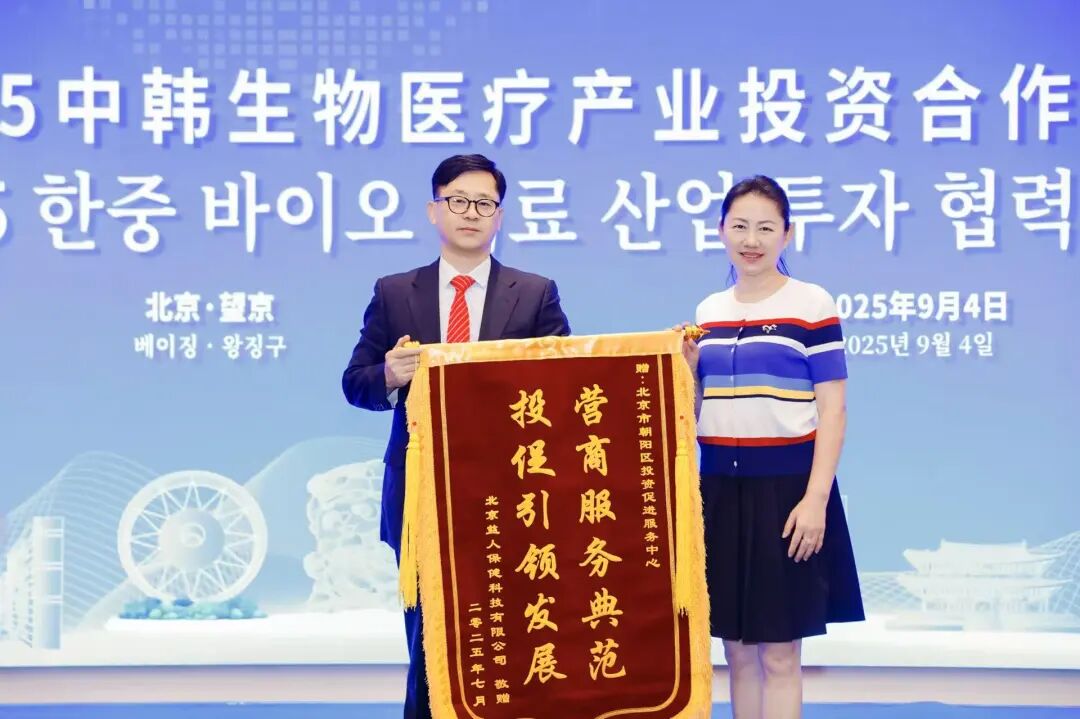 值得一提的是,北京益人保健科技有限公司代表崔畅训还为朝阳区投资促进服务中心送上了锦旗,感谢服务中心为韩资企业在中国落地中提供的贴心帮助。