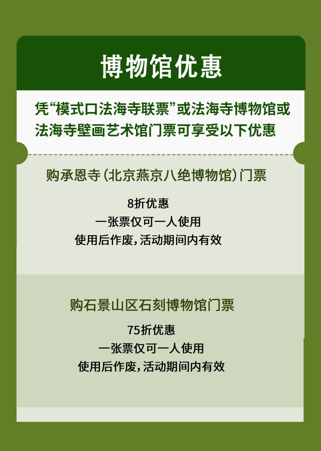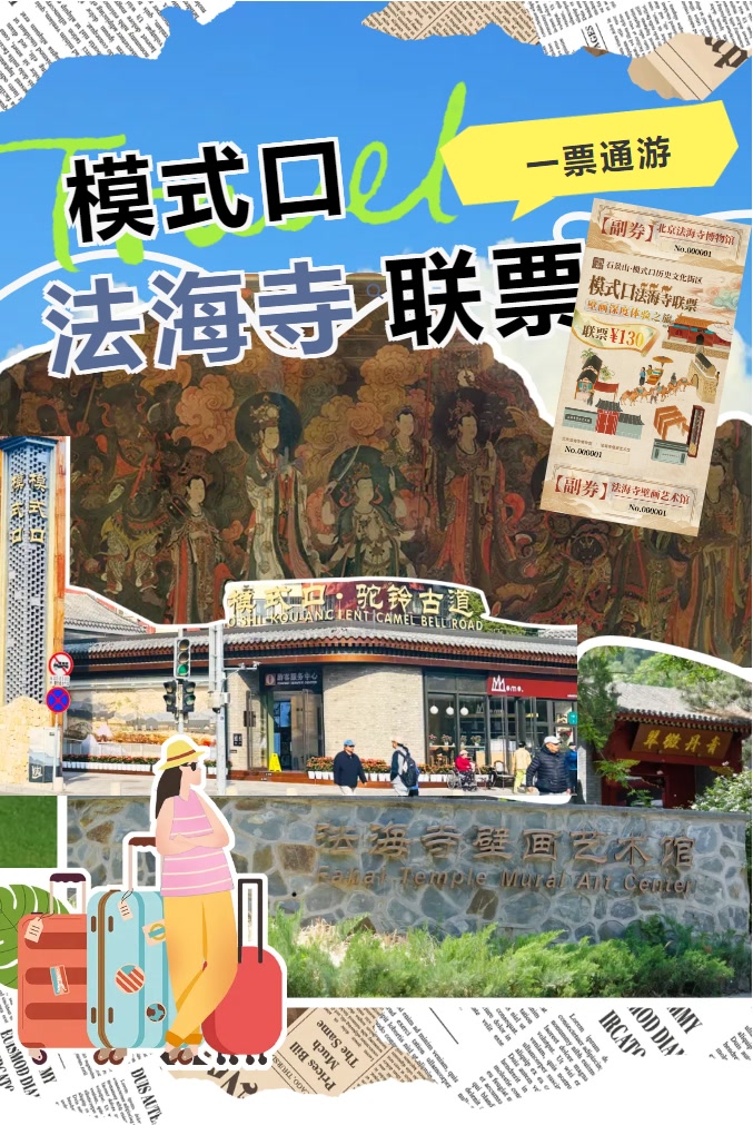 模式口历史文化街区推出的“模式口法海寺联票”,通过整合文旅资源深化融合效应,为游客带来别样体验。这张联票紧密联结法海寺的珍贵壁画真迹与壁画艺术馆的创新数字化展示,让游客便捷深入地领略文化瑰宝的双重魅力;更以 “票根 +” 模式串联多元消费场景 —— 凭票可畅玩承恩寺、石景山区石刻博物馆等景点,还能在街区餐饮、文创商户享受专属折扣,实现文化体验与休闲消费的无缝衔接,轻松解锁新体验。