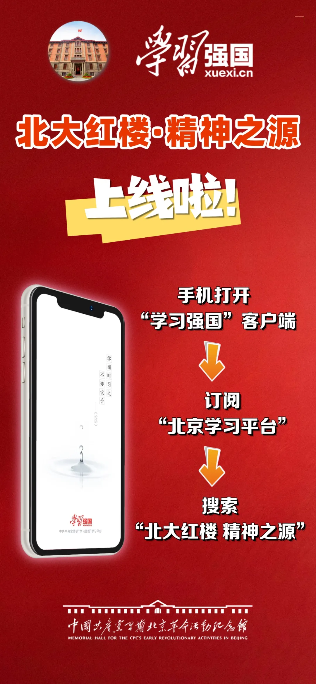 9月8日,“学习强国”北京学习平台在北京频道导航栏正式上线“北大红楼·精神之源”。“北大红楼·精神之源”以习近平新时代中国特色社会主义思想为指引,以习近平总书记在北大红楼参观时的重要指示精神和在中央政治局第三十一次集体学习时的重要讲话精神为根本遵循,是传承红色基因、弘扬伟大建党精神的重要阵地。