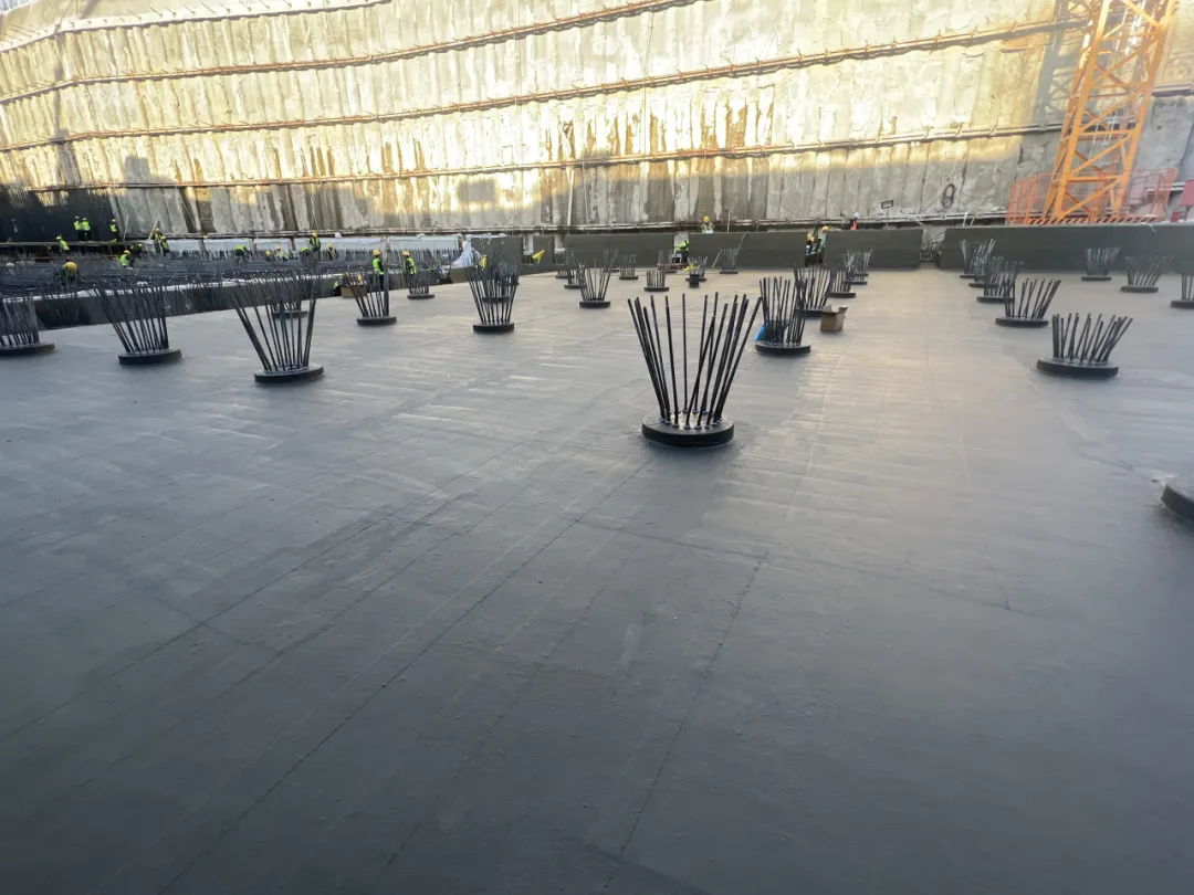 “皮肤式”丙烯酸防水涂料可实现与结构同寿命的耐久性,丙烯酸防水涂料为偏无机类材料,绿色环保,施工过程采用“两布六涂”工艺,不动火,施工安全,防水涂料与结构满粘,解决了常规防水材料串水渗漏的通病。