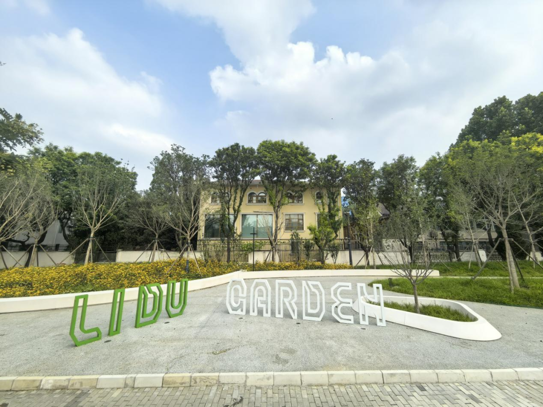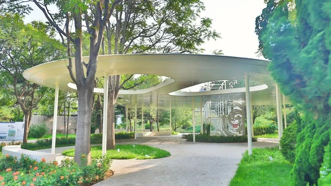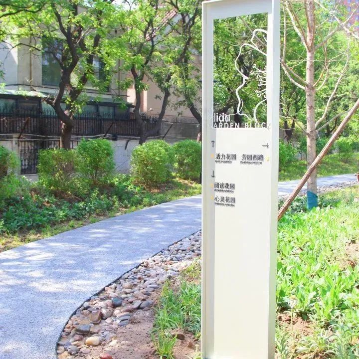 将台历史发展文化墙,记录着将台的过去。顺着展墙往里走,是与原有大树融为一体的新视觉中心。林荫下的花园中心驿站,既能歇脚乘凉。又能通过花卉科普墙认识月季、绣球、鸢尾,坐着就能“涨知识”。