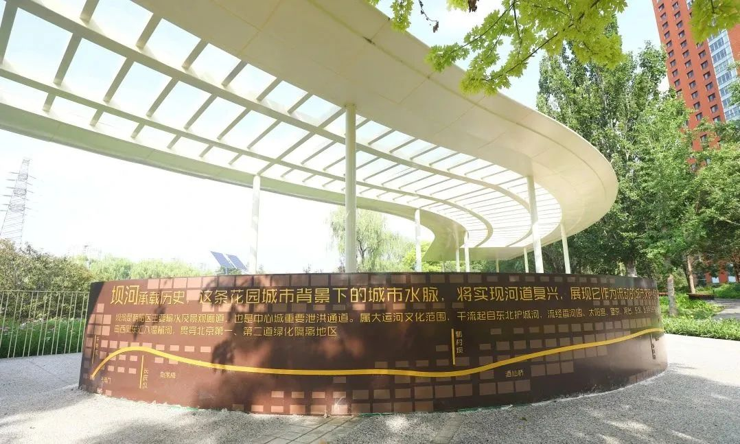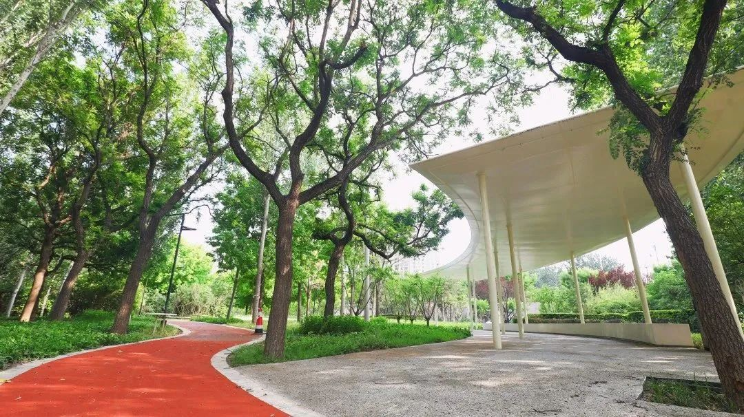 此外,朝阳区还通过花园示范街区建设,实施石林广场改造、地铁12号线沿街绿地花园步行街改造等,让花园城市建设覆盖丽都整个片区。改造之后,健康步道、朝阳绿道、坝河滨水绿道得以无缝衔接,并增添了滨河观景廊架,市民游客可以落座休息。