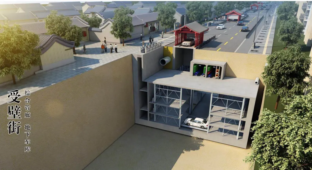 像拼乐高一样,把电力、通信、热力、燃气、给水、雨水、污水7大类18种管线,与一座4层智能立体车库精准叠放进地下9米。传统做法需三次破路,受壁街只挖一次,就让老胡同多保留了3200块老城砖;管廊与车库共用围护、共用通风、共用消防,节省投资22%,缩短工期40%,真正做到了“少挖一次路,多保一片老城砖”。