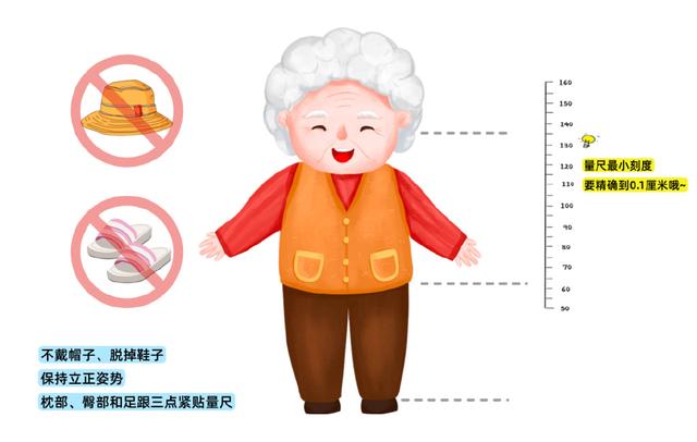 测量身高时,应使用最小刻度为0.1厘米的量尺,老人不戴帽子、脱掉鞋子,保持立正姿势,让枕部、臀部和足跟三点紧贴量尺。