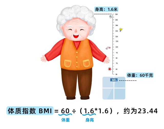 例如,一位体重60千克、身高1.6米的老人,他的BMI= 60÷(1.6*1.6),约为23.44。