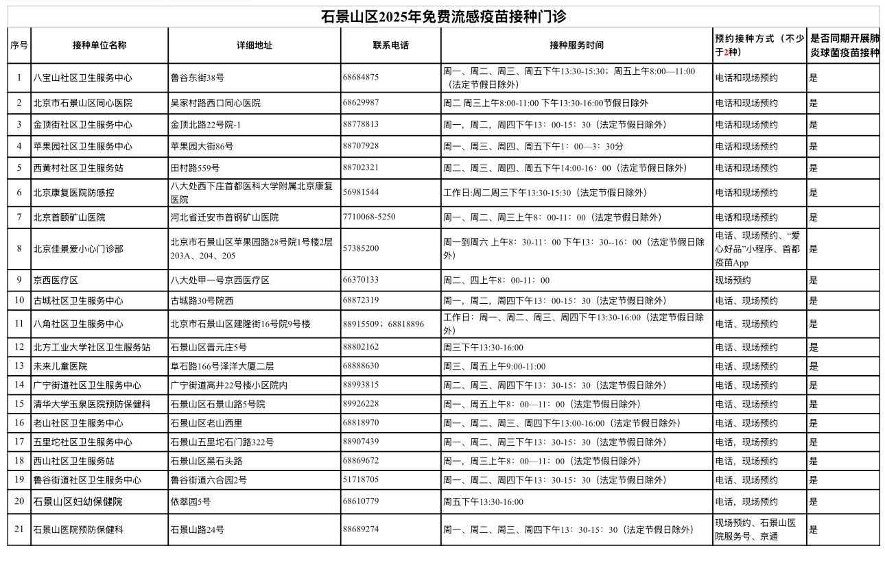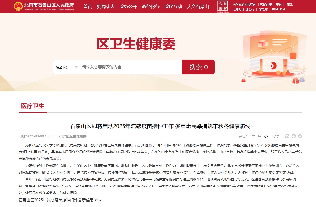 2025年北京流感疫苗接种工作于9月10日正式启动。今年免费流感疫苗接种仍面向60岁及以上的京籍老年人;各类中小学校在校学生;中小学校、医疗机构、疾控机构和养老机构等重点行业一线工作人员;各区疾控、卫生健康行政部门认定的重大活动应急保障人员。同时,其他人群也可以自费接种流感疫苗。各区根据辖区实际,分批次有序开展各类人群疫苗接种。全市流感疫苗免费接种工作将于2025年11月底结束,自费接种工作将持续至2026年2月底。
