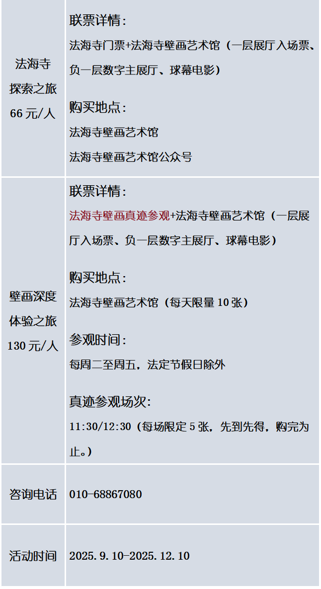 节假日开放方案及临时闭馆等特殊情况,请关注“法海寺壁画艺术馆”公众号相关公告。