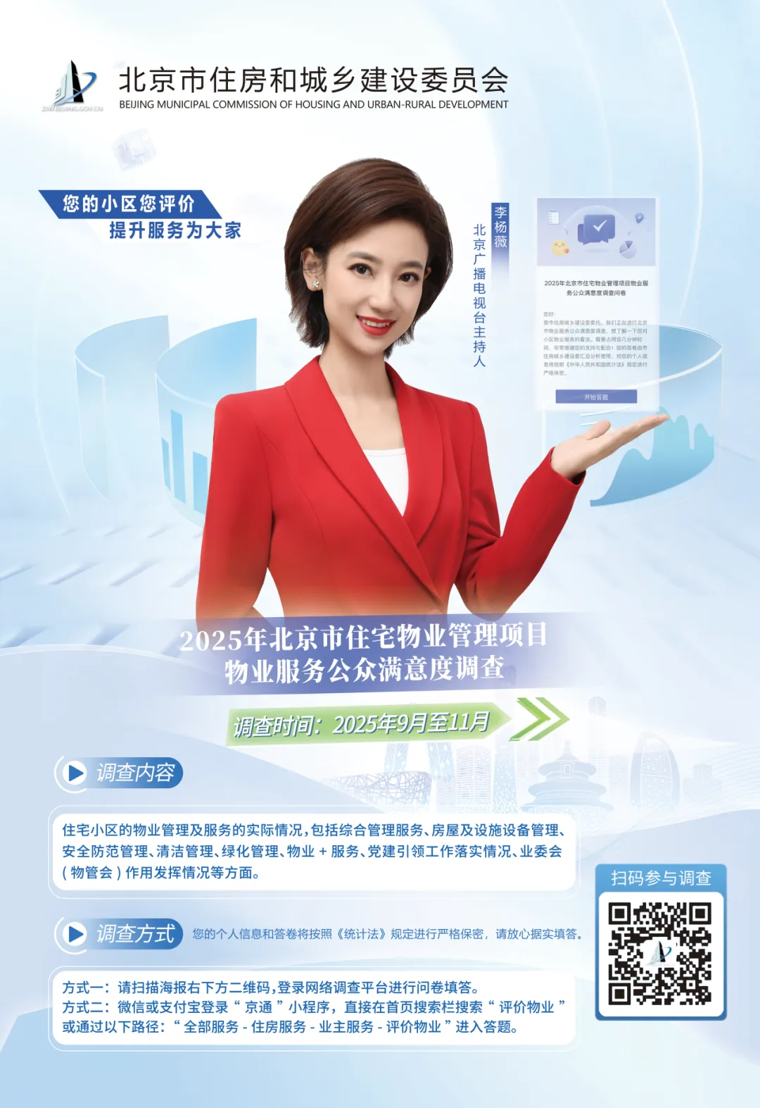 为深入了解居民对住宅物业服务的满意度,掌握物业服务现状及存在的问题,有效满足居民多样化的生活服务需求,北京市住房和城乡建设委员会正式启动2025年住宅物业管理项目公众满意度调查。即日起至11月底,全市居民均可为自家小区物业服务打分!