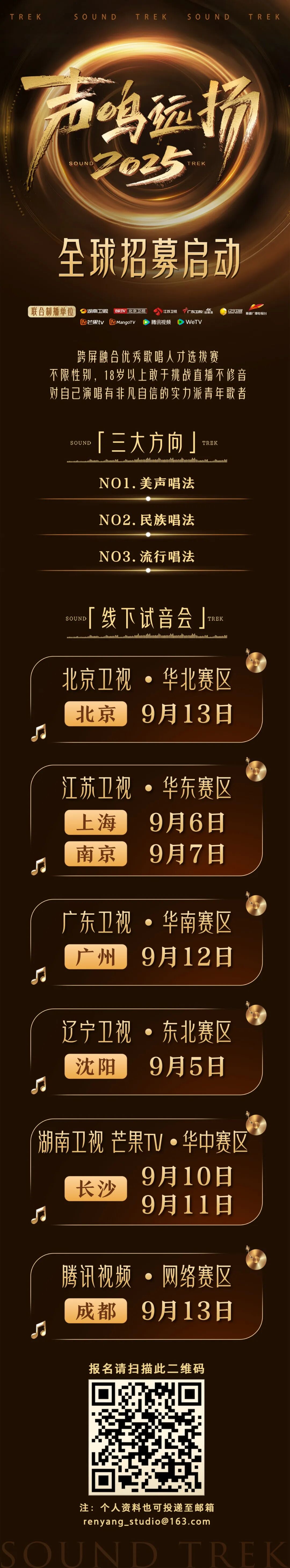 湖南广电旗下湖南卫视、芒果TV,协同北京卫视、江苏卫视、广东卫视、辽宁卫视、新疆卫视和腾讯视频,八大平台联合制播的优秀歌唱人才选拔类节目《声鸣远扬2025》近日正式启动。其中,六大赛区选手选拔要求和报名具体事宜一经发布,引发网友高度关注。