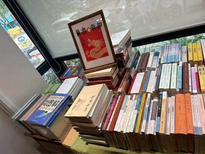 书店“旧书新知”展陈区人气颇高,《古文观止》《徐霞客游记》《红楼梦》等九成新书籍均以五折出售,实惠价格吸引读者选购。