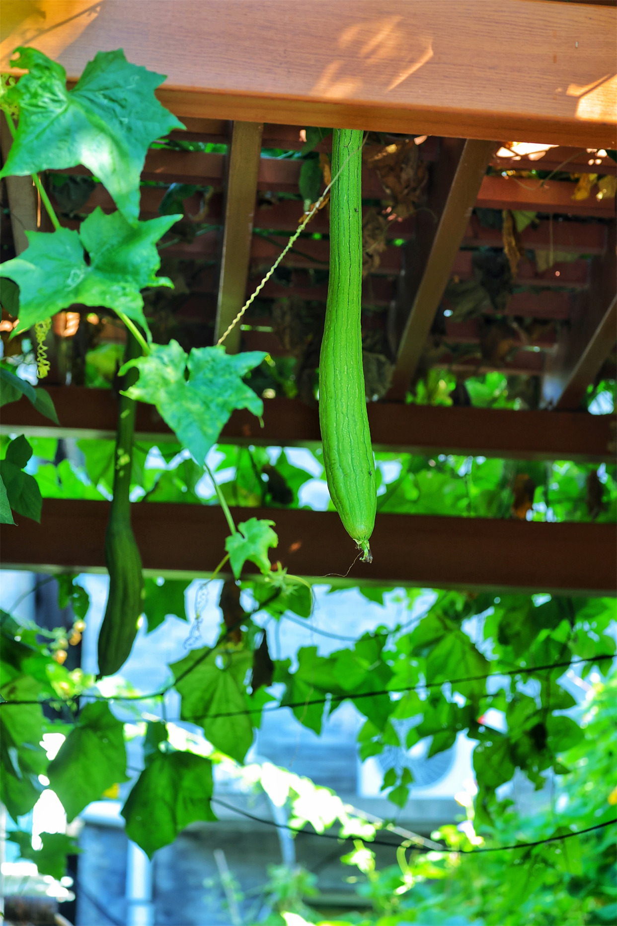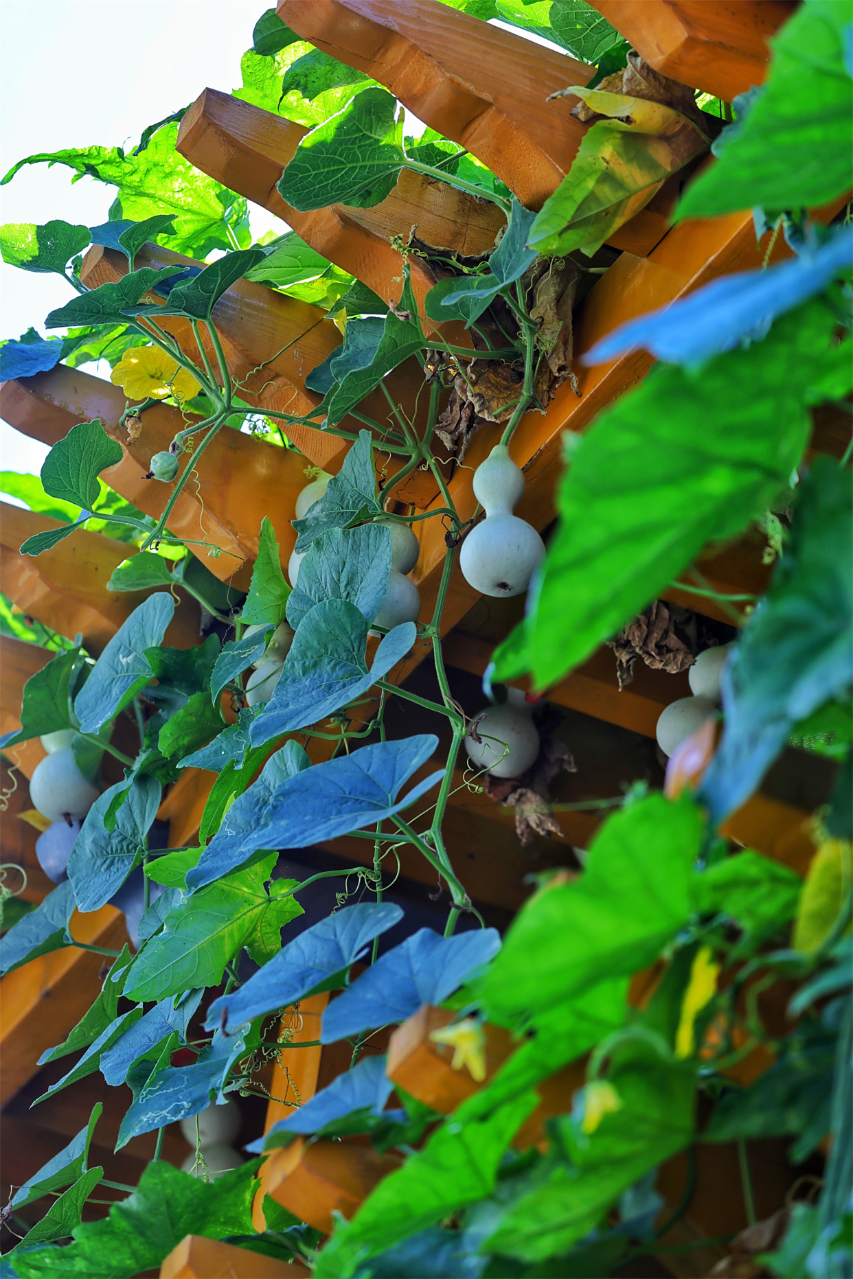 胡同深处,谁家院门口的枣树已是果实累累。清风掠过,枣子簌簌轻晃,惹得行人忍不住抬头多看几眼。墙根处的瓜架绿意正浓,藤蔓缠着木架子,长长的丝瓜垂在半空;一旁的紫眉豆结满长荚,葫芦也挨个儿挂满藤架,一切都透出秋日的丰饶气象。