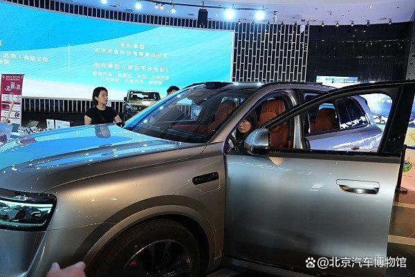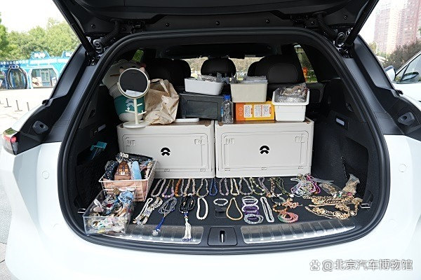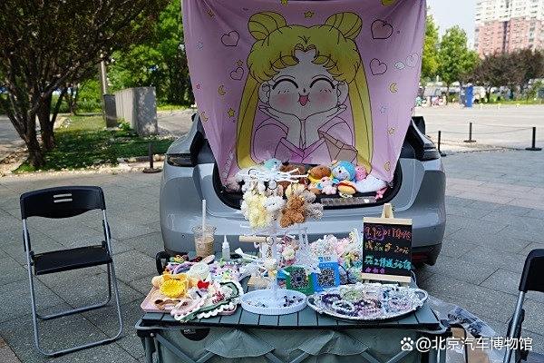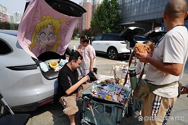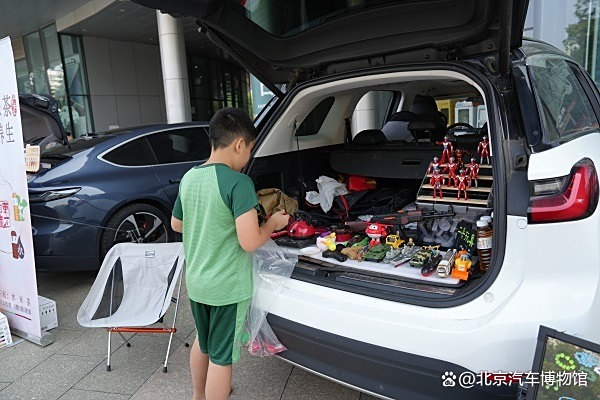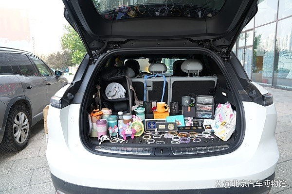在北京汽车博物馆中庭,展示了中石油昆仑网电、小米汽车、蔚来汽车、广汽汽车、路特斯等企业的最新车型,观众参与互动还能领取礼物。广场上是“蔚来新能源车主文化市集”,车友后备箱里摆放的琳琅满目的“小玩意”,通过公益交换与公益售卖的方式就能迅速拉近社交距离。