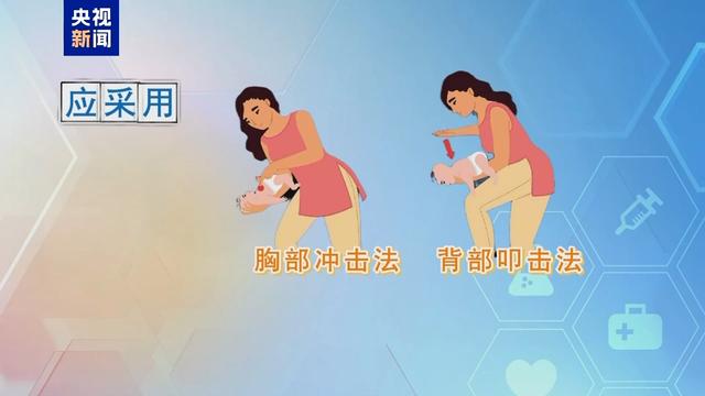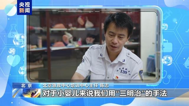 北京急救中心培训中心主任 陈志:对于小婴儿来说我们用“三明治”的手法,把婴儿抱起来,把他头冲下,用大鱼际拍击他的两个肩胛中间位置,一秒一次快速拍击,一共拍5次,翻过来以后,再用两个手指在两乳头连线下方这个位置进行5次冲击式按压,一秒一次,反复操作,直到异物冲出为止。