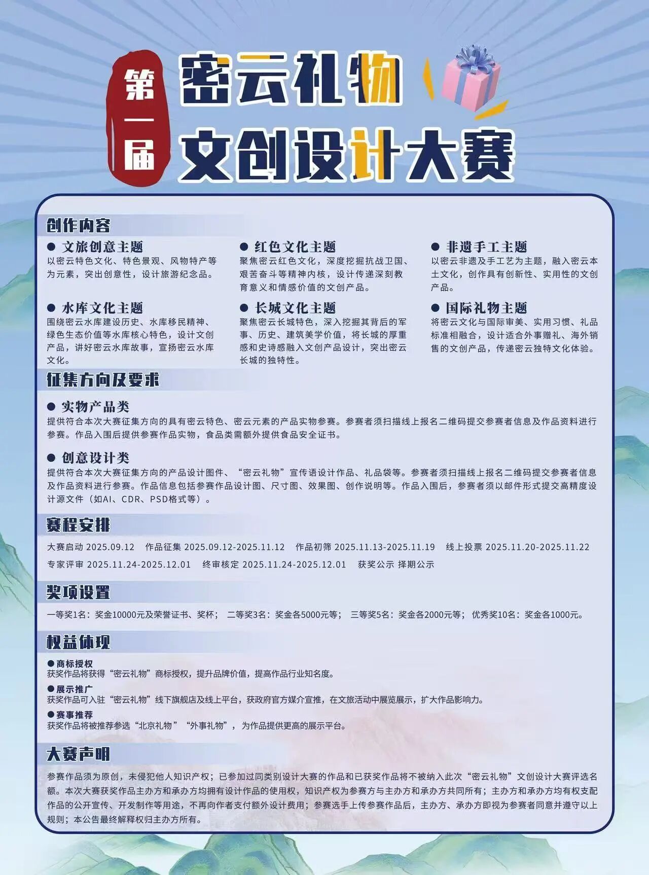 汇聚创意力量,共促密云发展。现诚邀社会各界创意人才踊跃参与,共同挖掘密云文化魅力,设计出彰显密云特色、兼具创新性与实用性的“密云礼物”,为密云文旅产业发展、乡村振兴注入新动能。