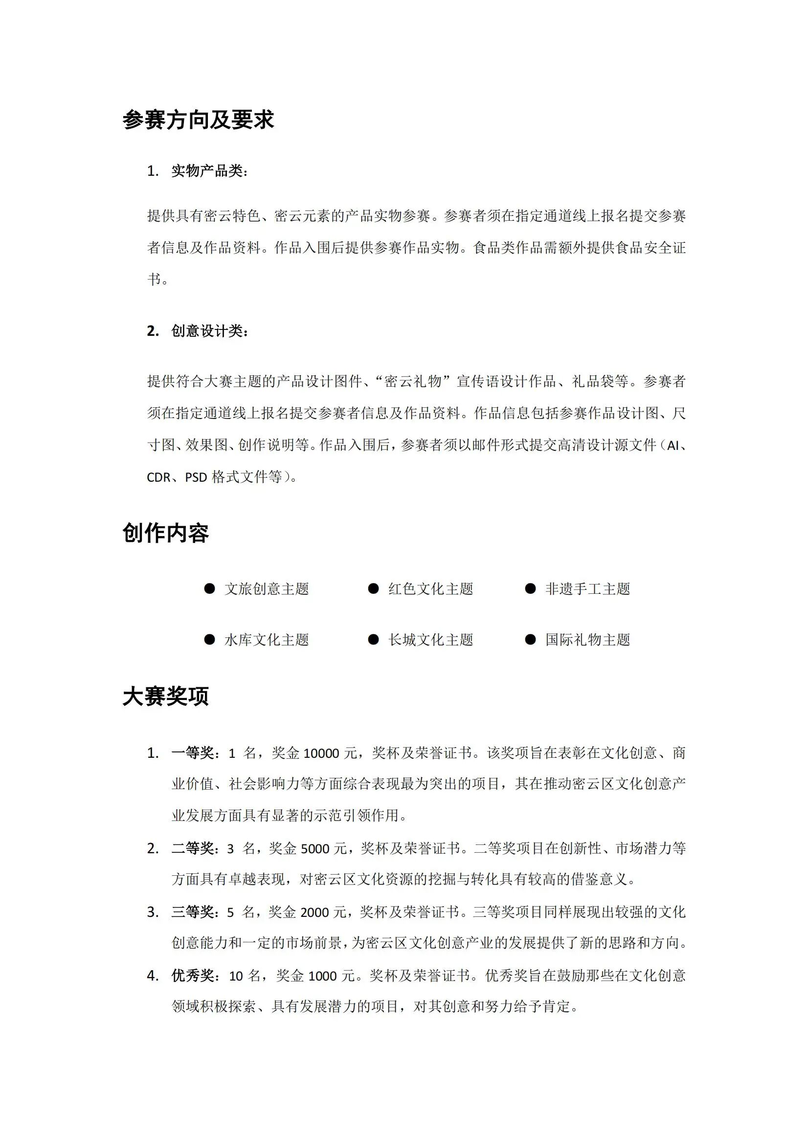 覆盖多元群体,聚焦六大主题。大赛参赛对象覆盖广泛,大中专院校师生、非遗传承人及手工艺爱好者、文创企业与设计机构、个人设计师及创意爱好者均可以个人或团队形式参赛。参赛者可聚焦六大创作方向:一是红色文化主题,聚焦密云红色文化,深度挖掘抗战卫国、艰苦奋斗等精神内核,设计传递深刻教育意义和情感价值的文创产品;二是以密云特色文化、特色景观、风物特产等为元素,突出创意性,设计旅游纪念品;三是非遗手工主题,以密云非遗及手工艺为主题,融入密云本土文化,创作具有创新性、实用性的文创产品;四是水库文化主题,围绕密云水库建设历史、水库移民精神、绿色生态价值等水库核心特色,设计文创产品,讲好密云水库故事,宣扬密云水库文化;五是长城文化主题,聚焦密云长城特色,深入挖掘其背后的军事、历史、建筑美学价值,将长城的厚重感和史诗感融入文创产品设计,突出密云长城的独特性;六是国际礼物主题,将密云文化与国际审美、实用习惯、礼品标准相融合,设计适合外事赠礼、海外销售的文创产品,传递密云独特文化体验。