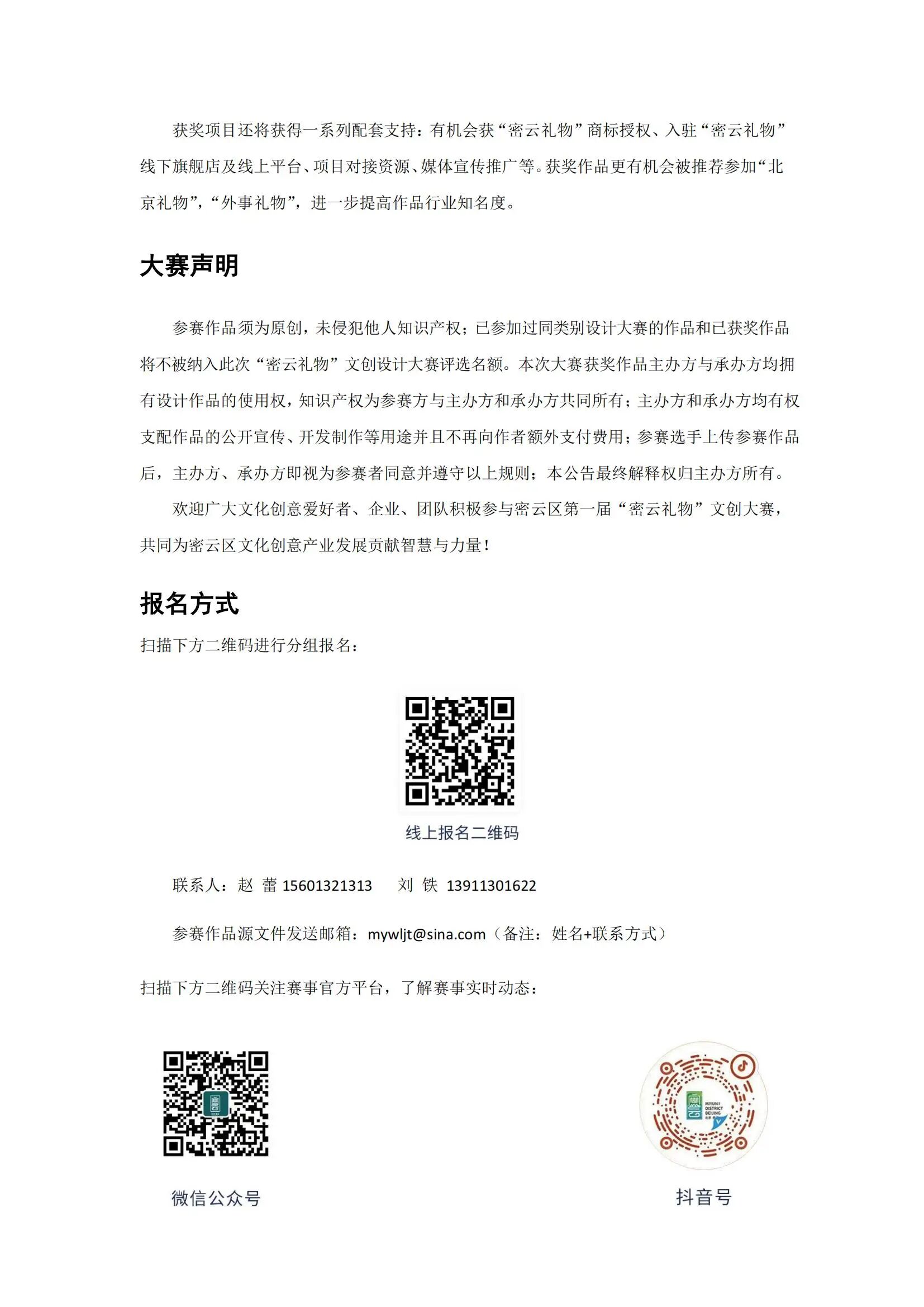 丰厚奖励加持,提供多元发展机会。赛事设置丰厚奖项与多元权益,实物产品类和创意设计类分别设有一等奖1名(奖金10000元+荣誉证书+奖杯)、二等奖3名(各5000元+荣誉证书)、三等奖5名(各2000元+荣誉证书)、优秀奖10名(各1000元+荣誉证书)。获奖作品不仅能获得奖金与荣誉,还可获“密云礼物”商标授权,入驻线下旗舰店及线上平台,获政府官方媒介宣推,更有机会被推荐至“北京礼物”“外事礼物”等更高平台。