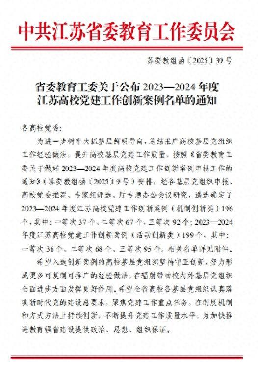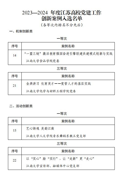 近日,江苏省委教育工委公布了2023-2024年度江苏高校党建工作创新案例评选结果,我校获评党建工作创新案例一等次2项,三等次2项,涵盖机制创新和活动创新两类。食品学院党委《“一盟三链”激活教育强国奋进引擎联建共建模式创新与实践》获评机制创新类一等次;人文学院音乐舞蹈系教工党支部《艺心铸魂美韵江南》获评活动创新类一等次;化学与材料工程学院党委《金典讲习 化育英才——党管人才的基层实践》获评机制创新类三等次;机关党委宣传部、融媒体中心党支部《以“实心”励“实行”,让“走新”更“走心”》获评活动创新类三等次。