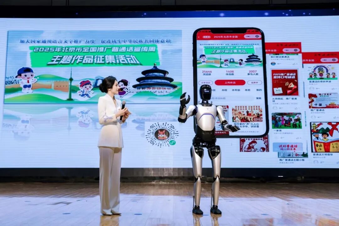 在活动介绍环节,AI机器人与主持人展开趣味互动,详细解读本届推普周的重磅亮点:其一为2025年北京市全国推广普通话宣传周主题作品征集活动,9月1日至21日期间,公众可围绕推普周主题,融入北京文化元素,以海报、书法、绘画、剪纸、篆刻等形式,记录推普一线精彩瞬间,通过“丘瑞斯”北京市学生活动在线平台线上参与;其二是“雅言传承文明 经典浸润人生”语言文字系列活动,包含校园语言文化建设案例宣讲、学生悦读乐写、教师语言文字育人故事征集、亲子同创共讲四大“春华杯”子活动;其三为“童言心语 点亮未来”品牌活动创新成果展示,作为北京教育系统“童语同音”计划的重要实践,该活动将借助人工智能技术,提升学前儿童语言应用水平与幼师教学能力,打造“人工智能+儿童语言教育”新模式。