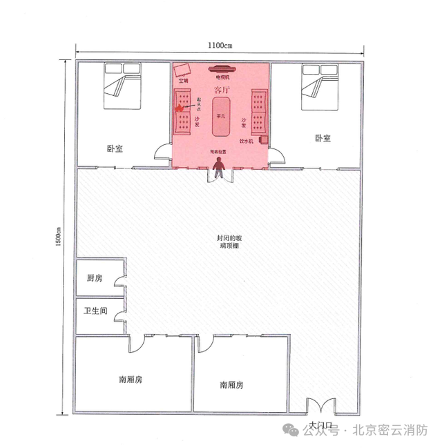 正房呈现中间客厅烧毁严重,东西两侧卧室烧损较轻(烟熏)的状态。中间客厅石膏板吊顶散落到地面,客厅东西两侧各放置一个沙发,客厅北侧为木柜,两个沙发及木柜均烧失。西侧沙发烧损程度高于东侧沙发,西侧沙发燃烧仅剩部分弹簧部件,西侧沙发西南侧弹簧部分烧损缺失,距西墙50cm处形成一处10cm*10cm碳坑。