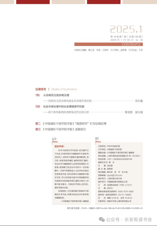 包心鉴在《中国浦东干部学院学报》2025年第1期撰文《从协商民主到协商治理——协商民主的治理功能及其治理价值实现》指出,协商民主是中国特色民主政治的特有形式,是中国共产党的群众路线在政治领域的重要体现,是凝聚广大人民共同意志、形成最大公约数的重要路径,是全过程人民民主的重要组成部分,具有独特的制度优势、制度功能、制度作用和制度功效。协商民主所蕴含的政治参与、决策修补、多元共治、政治监督等方面的强大治理功能正在转化为推进国家和社会治理现代化的强大治理效能。在这一过程中,人民政协作为专门协商机构,具有不可替代的制度优势和重要作用。