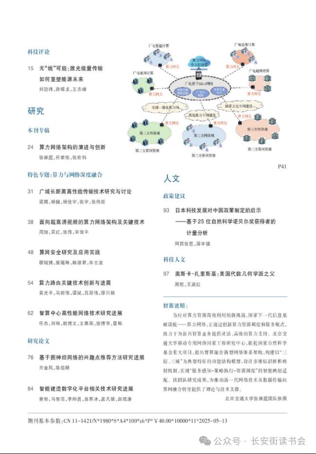 张维庭、任家栋、张宏科在《科技导报》2025年第9期撰文《算力网络架构的演进与创新》指出,随着数字经济的快速发展,算力网络有望成为新一代信息基础设施,其对于发展“新质生产力”的重要性日益凸显。梳理并调研了算力网络的发展需求与现状、发展趋势、关键问题与挑战及应用示范验证。研究发现,算力网络呈现出多元泛在、智能敏捷、安全可靠、绿色低碳等特征。但当前仍处于起步阶段,在技术体系和工作机制方面尚未达成共识。针对上述挑战,从国家、行业和技术层面提出了加快顶层设计和标准制定、推进关键技术研发、构建绿色产业生态等发展建议。这些建议对促进算力网络与传统网络深度融合、加速数字经济发展具有重要意义。