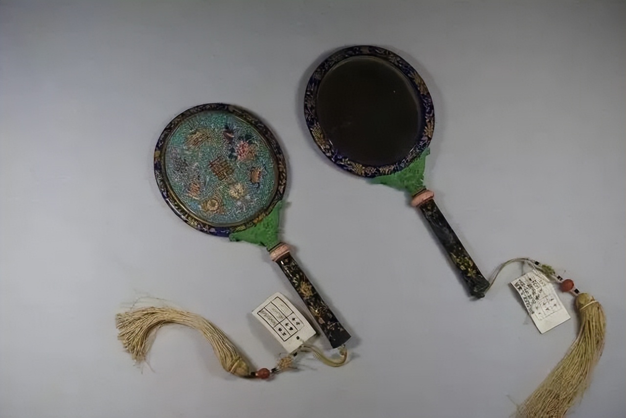 这两面把镜正在慈禧陵“翰墨留香”展览上展出。正式名称:铜胎烧蓝画珐琅嵌骨八宝双喜把镜。名称够繁琐的吧,其中门道且听小编慢慢给各位看官道来——