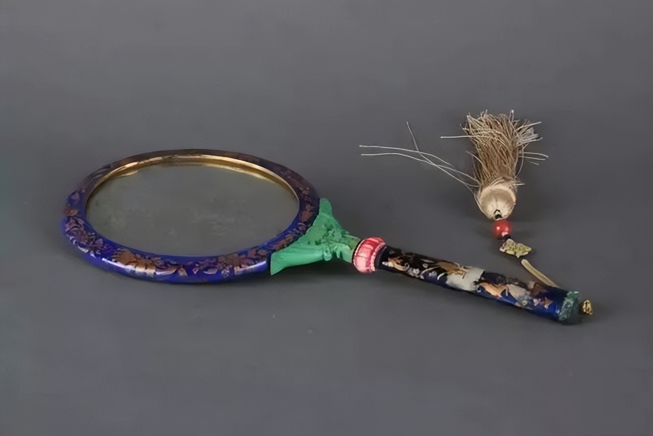 小小的把镜,手中之物,制作之时却动用了烧蓝、画珐琅、雕刻、染色,镶嵌、流苏等等若干工艺。要众多部门的精诚合作才可以完成。