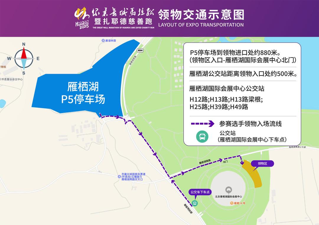 雁栖湖P5停车场距离国际会展中心领物现场约1公里,停车位有限,请选手尽量不要开车前往,为了您出行顺利,请选择乘坐公共交通前往领物现场。