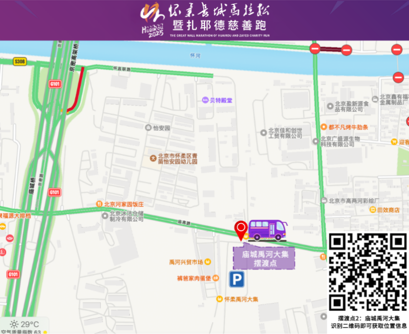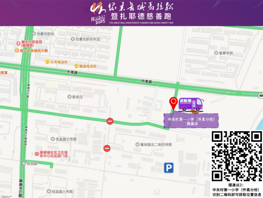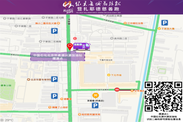 1、慕田峪长城博物馆马拉松摆渡车上车点(慕田峪长城P2停车场)——中关村第一小学怀柔分校——中国石化北京怀柔源兴源加油站——庙城禹河大集。