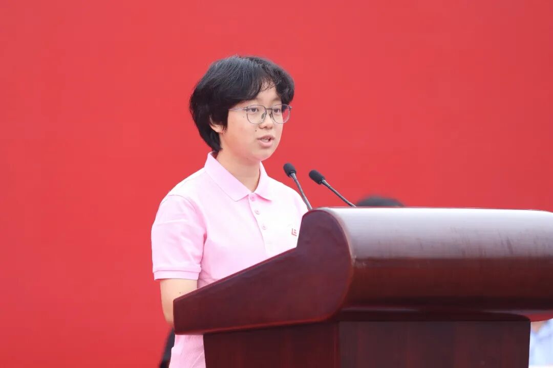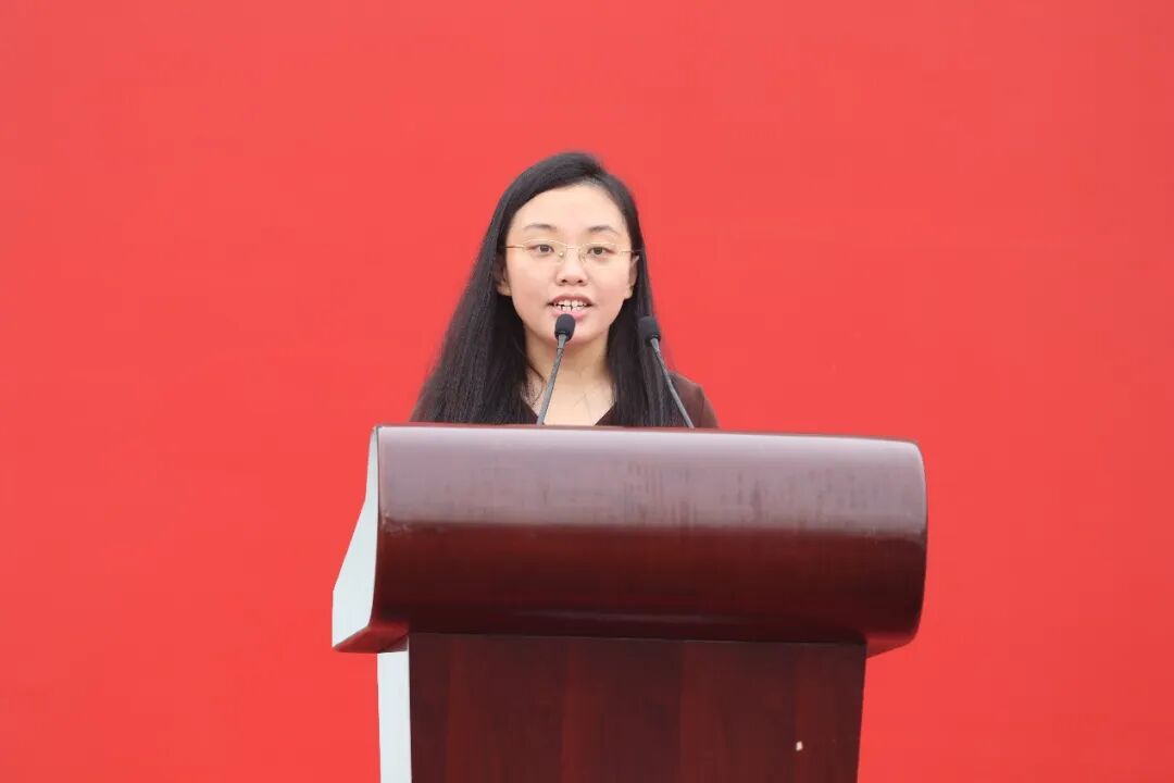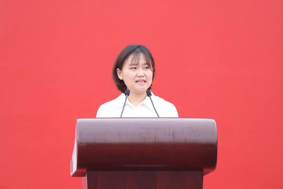 教师代表马克思主义学院张雯迪老师登台发言,她以“烽火记忆·赓续红色血脉”为主题,激励新生铭记历史、砥砺前行,以匠心立志、以技能报国,她强调,红色基因是职教学子的精神底色,唯有不忘初心,方能行稳致远。