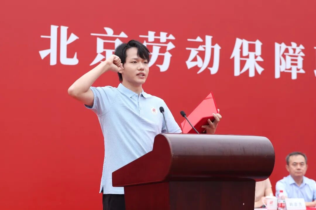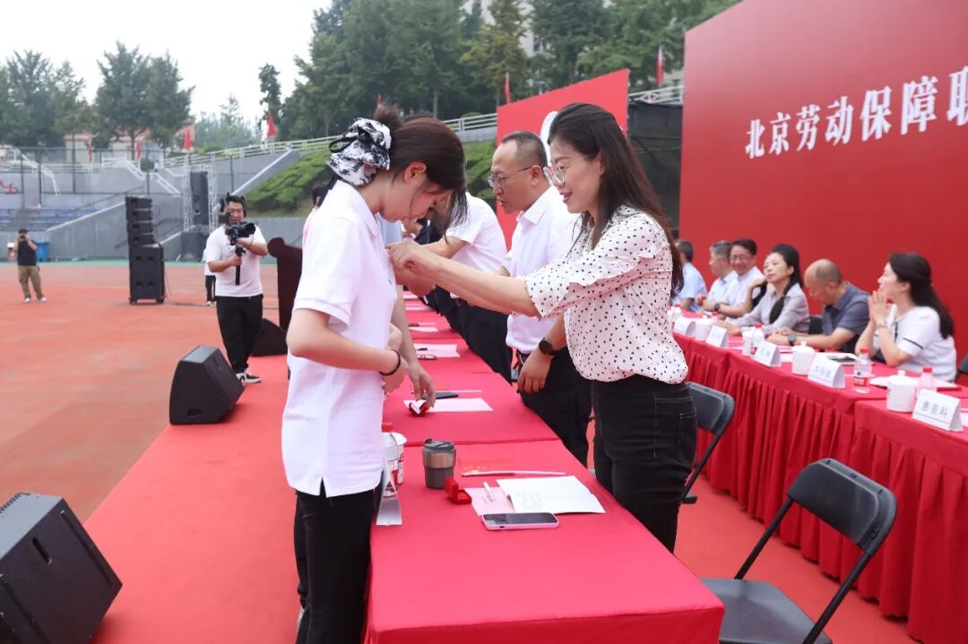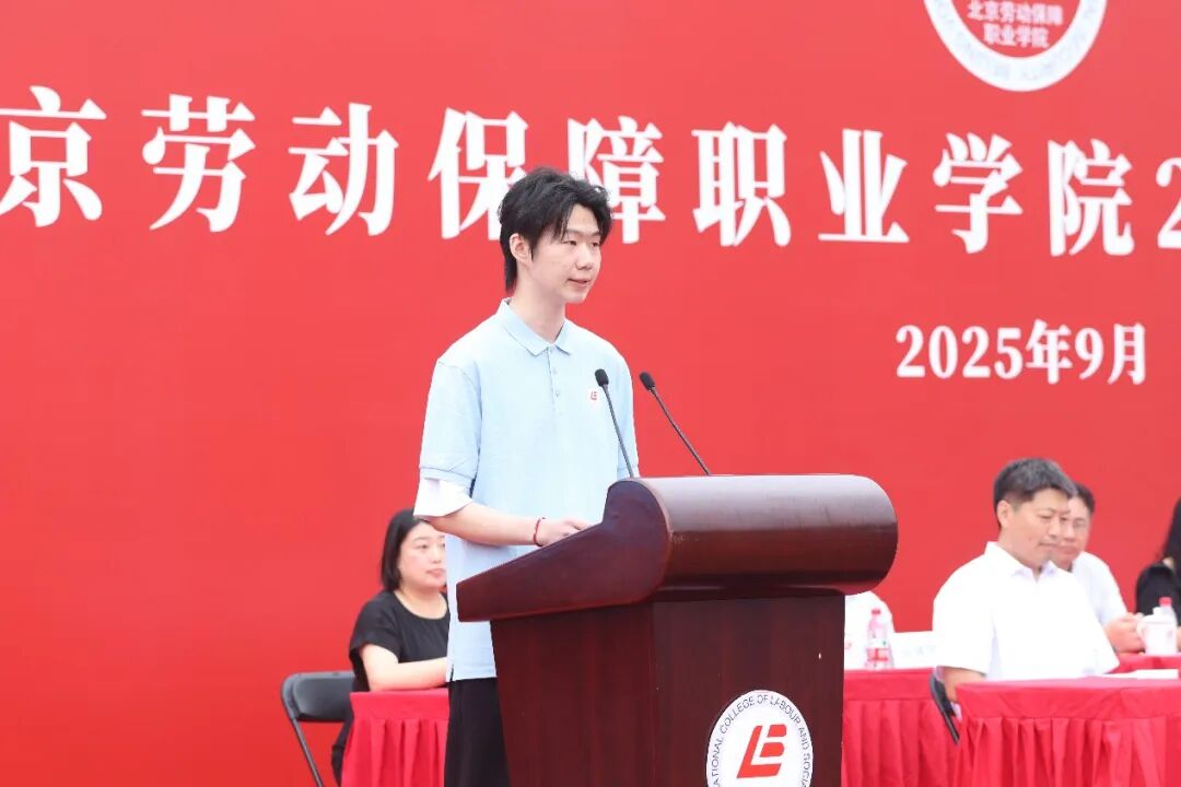 校领导庄重为新生代表佩戴校徽,一枚枚徽章熠熠生辉,承载着学校的嘱托与期望。全体新生肃立,举起右拳,以青春之名庄严宣誓:“今天,我成为北京劳动保障职业学院的一名学生,将胸怀远大理想,热爱伟大祖国,培养高尚品德,塑造健全人格,明理笃行,惟精惟一,尊师守纪,务实好学,不断创造超越,努力续写辉煌。”铿锵誓言回荡校园,彰显新时代职教学子的使命与担当。
