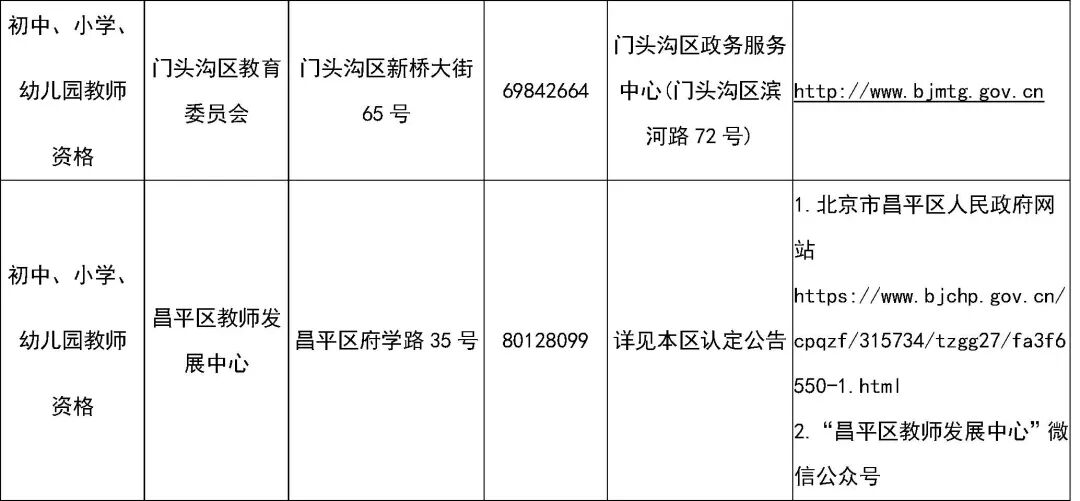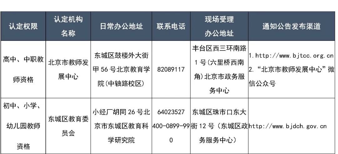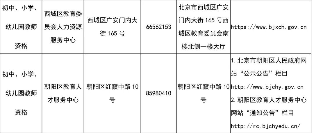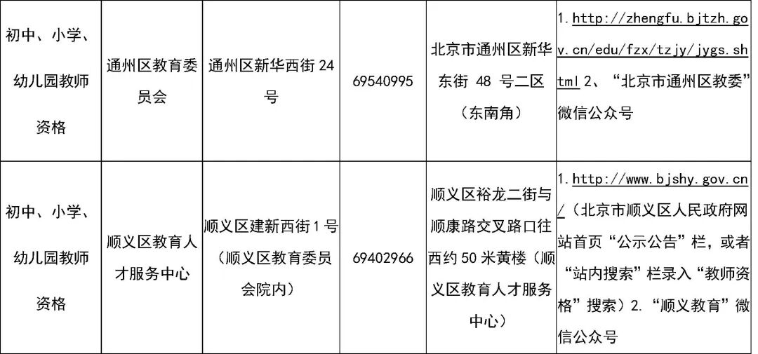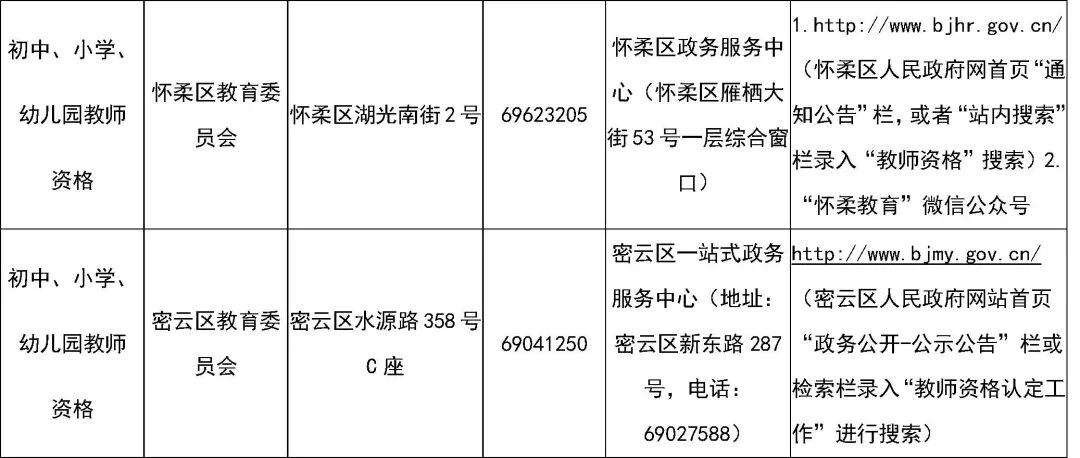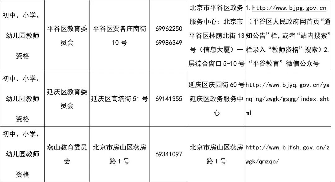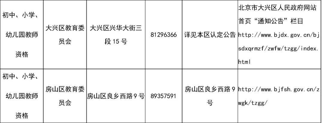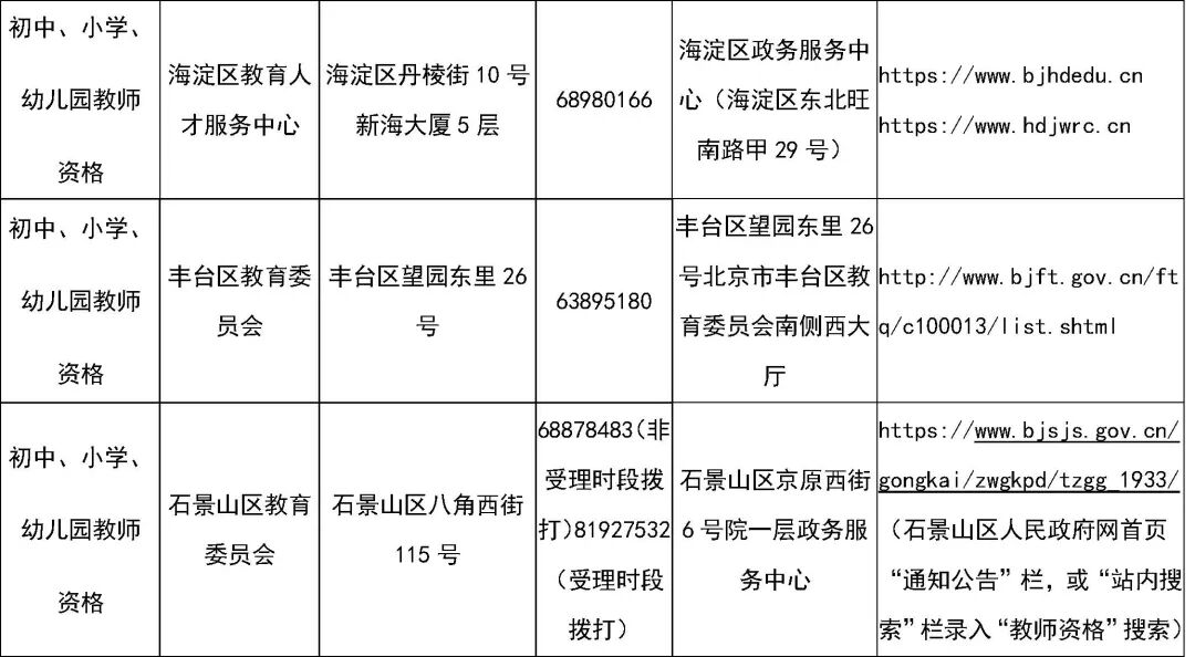 幼儿园、小学和初级中学教师资格,由区教育行政部门认定。报名方法及注意事项请查询各区发布的认定公告,各区联系方式请查看下图: