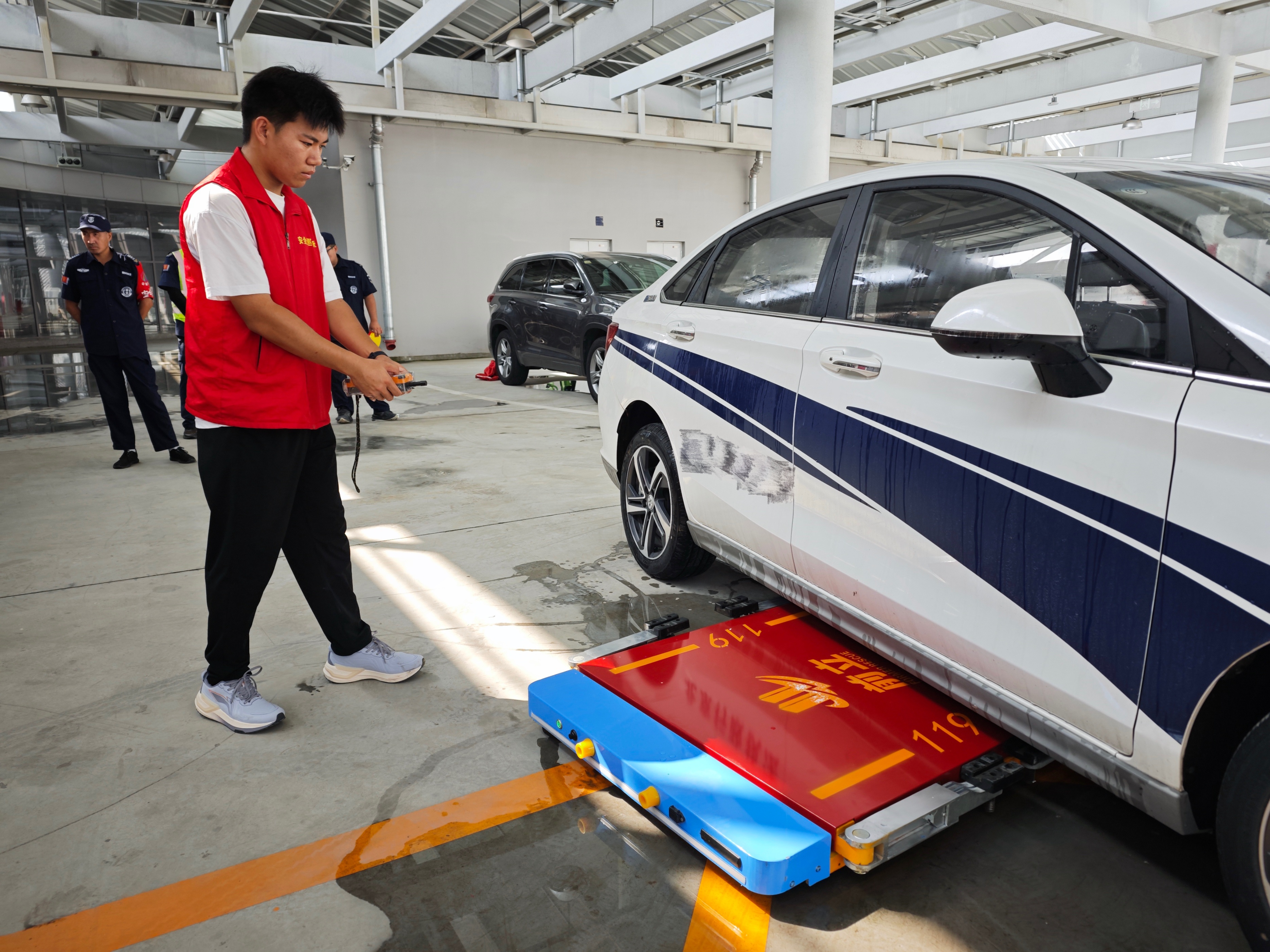 重点是灭火处置环节,面对模拟中起火车辆占据车道且易造成次生灾害的险局,本次演练首次使用电动挪车机器人,只见操作人员熟练地将设备置于车辆轮胎下,仅凭一人操作,便在短时间内将数吨重的故障车辆平稳、快速地转移至安全区域。这一装备的成功应用,为处置电动车火灾事故提供了全新的解决方案,极大提升了救援效率与安全性。