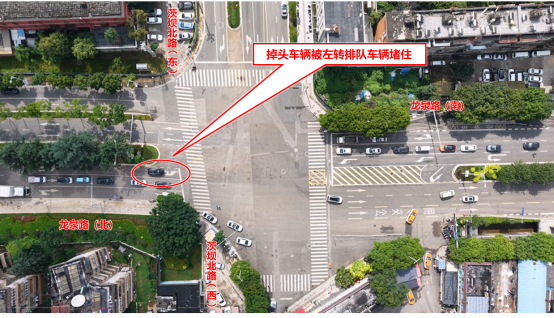 龙泉路与茨坝北路交叉口现状北进口左转与掉头车辆共用同一车道,由于掉头和左转需求均较大,常导致左转车辆排队挡住掉头车辆情况发生。