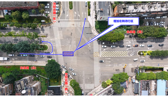 交管部门经过流量分析和优化研究,并采纳了周边居民提出的调整建议,认为增设左转待行区是相对可行的方案,可以有效减少左转车辆和掉头车辆的冲突,提升交叉口通行效率。