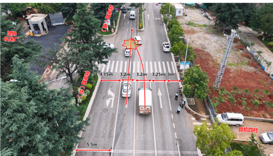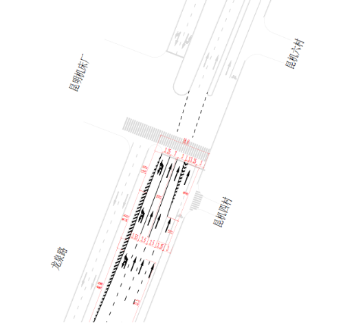 龙泉路与昆明机床厂、昆机四村交叉口现状北进口设置有4条车道,一条左转带掉头车道,三条直行车道,南出口设置有三条直行车道。