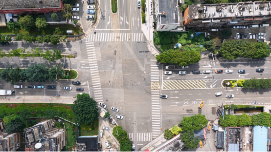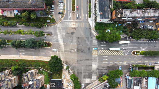 经过现场流线分析和航拍观测,发现北进口中间两条直行车道由于左转车道过宽和转向需求导致与南出口道的主路的两条车道并未对正,且路口未设置导流线。北口驶向主路的车辆,均倾向于驶入南口主路靠右侧车道,因此存在车流交汇情况,在一定程度上降低了交叉口通行效率。本次改造将压缩左转和掉头车道,同步调整直行车道方位,并增设导流线引导车辆。