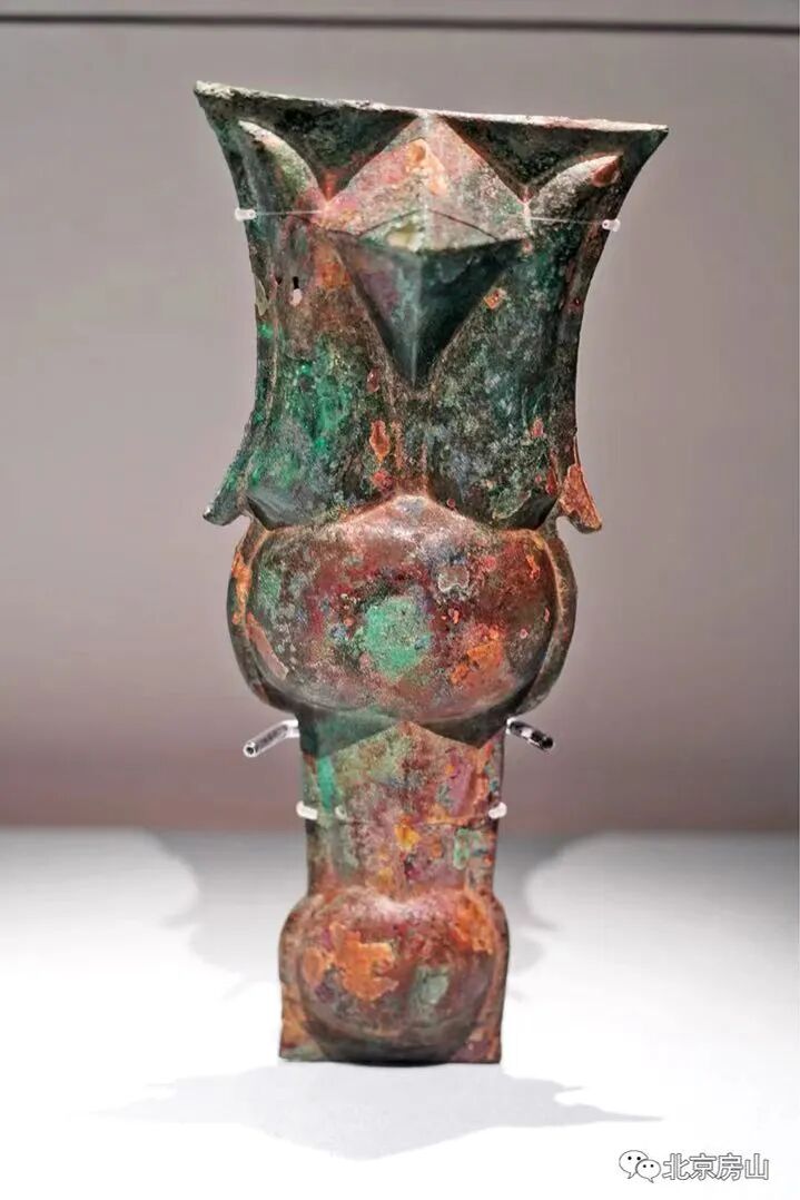 这件铜当卢中为一圆形泡,上方伸出二犄角,犄角间加以菱形凸起,下通过圆角长方形垂梁与较小圆形泡相连,在二犄角及垂梁背面各有一横鼻。青铜材质搭配对称规整的造型,让战马瞬间显得华贵精神,妥妥的“西周时尚单品”。