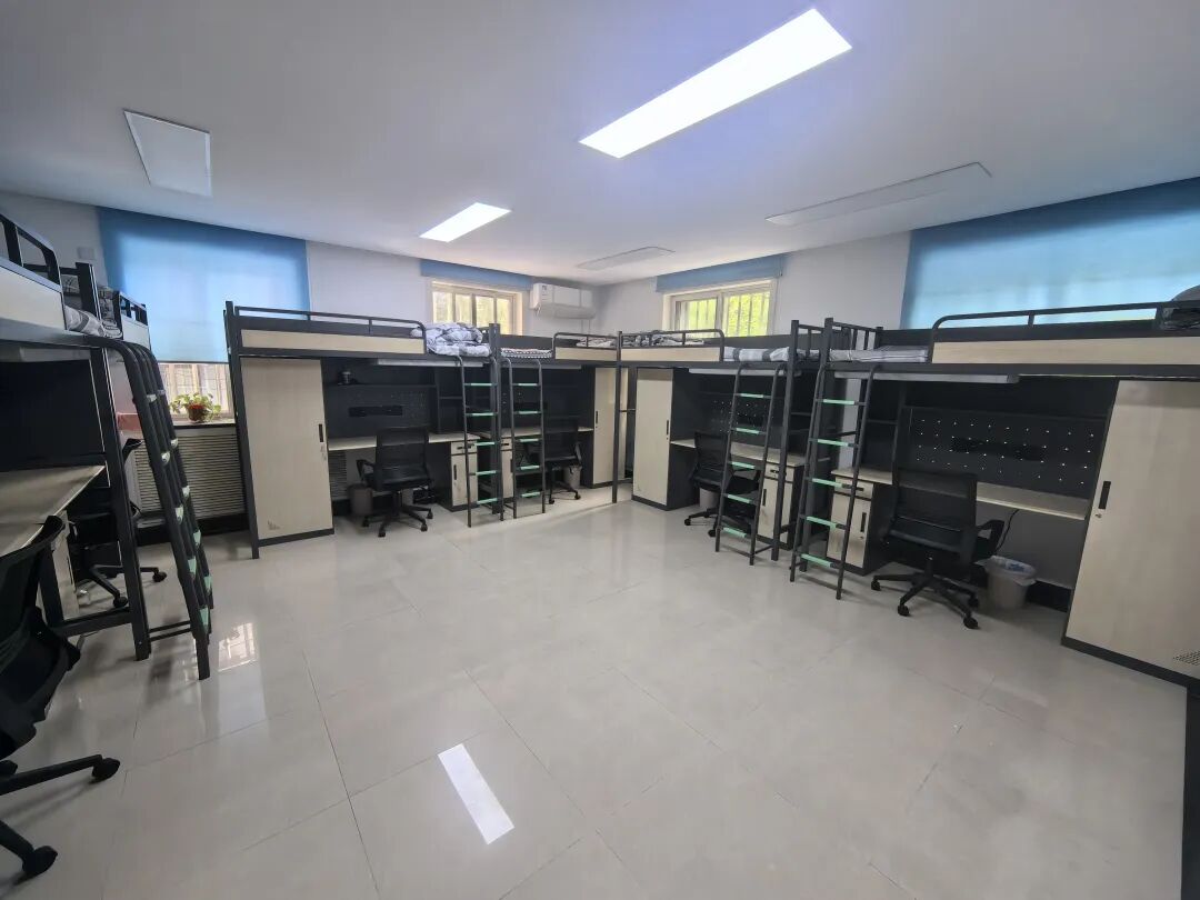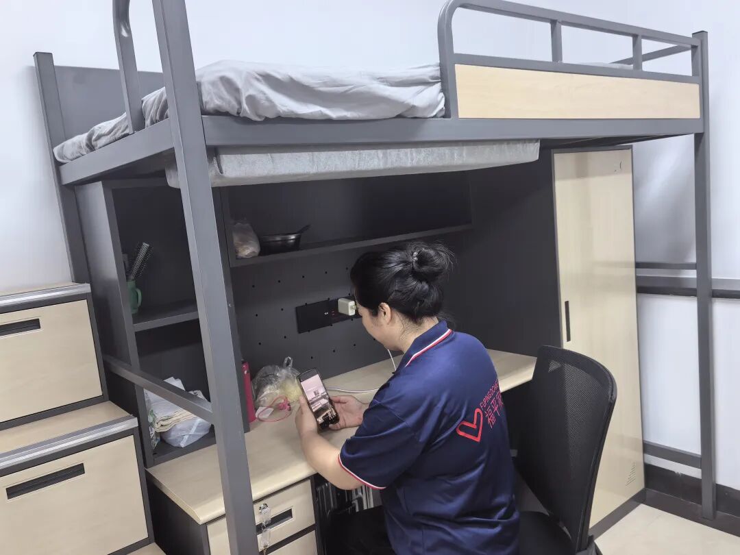 推开一楼6人间的房门,正午的阳光照进室内,明亮通透。床位都采用“上床下桌”的设计,床位之间距离很宽,在室内行走不会觉得拥挤。家政服务人员刘翠萍就住在这个6人间。