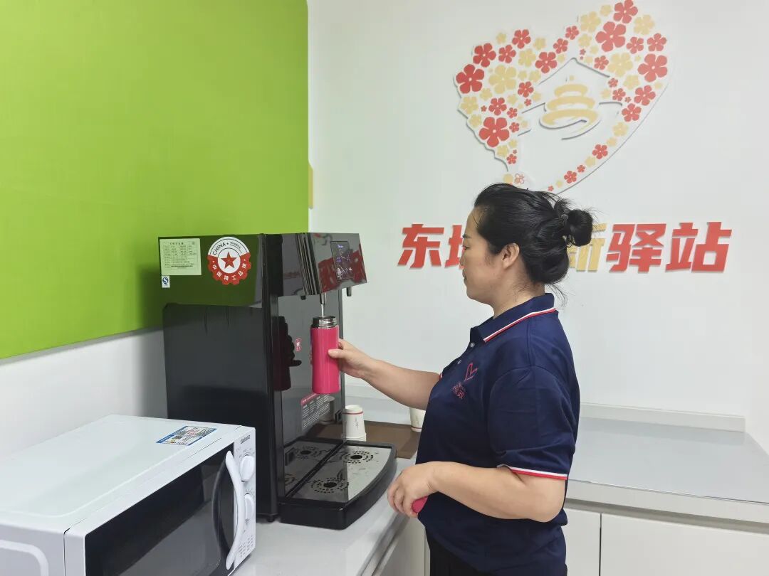 家政服务人员刘翠萍正在接热水。